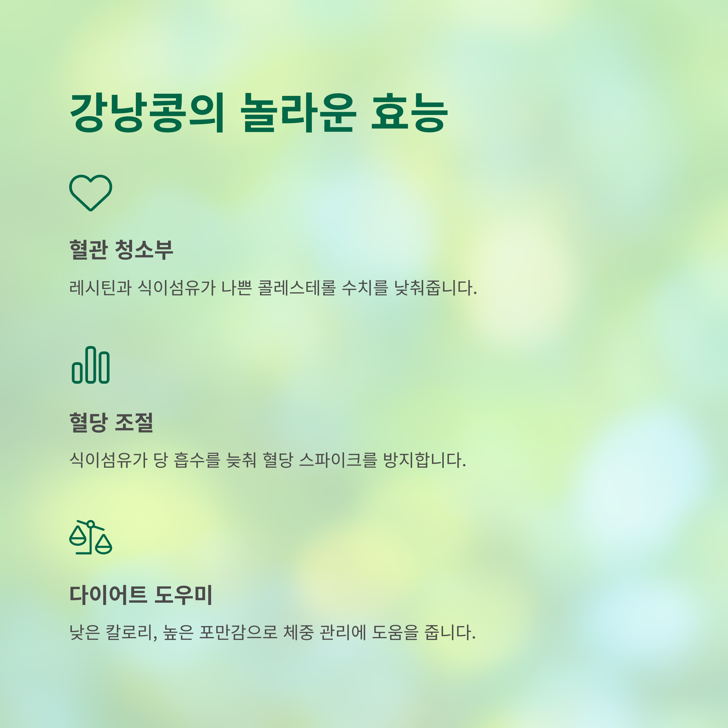- 혈관 청소부: 레시틴과 식이섬유가 풍부해서 혈관 속 나쁜 콜레스테롤 수치를 낮추고 혈액순환을 도와 고지혈증, 동맥경화 같은 심혈관 질환 예방에 탁월합니다.