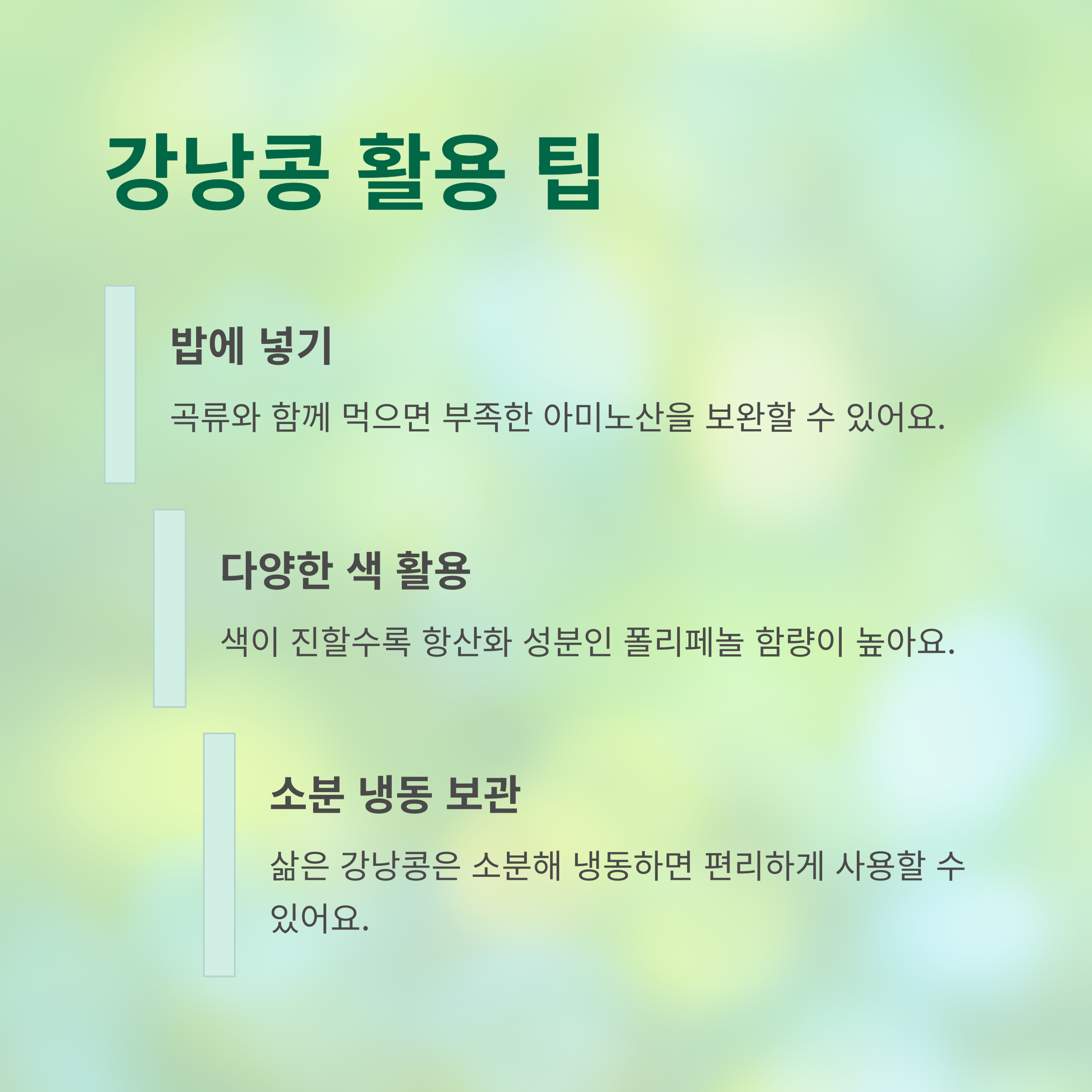 - 여성 건강 지원군: 식물성 에스트로겐인 이소플라본 성분은 여성호르몬과 유사한 작용을 해 갱년기 증상 완화에 도움을 줄 수 있습니다.