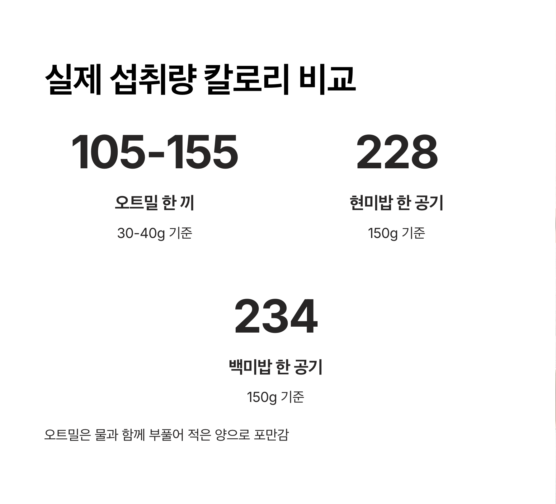 실제로 한 끼 기준으로 비교해보면 오트밀 30-40g은 105-155kcal 정도인데, 현미밥 한 공기(150g)가 228kcal, 백미밥이 234kcal니까 칼로리가 절반도 안 돼요. 그러니까 숫자에 속지 말고 실제 섭취량을 기준으로 생각해야 한다는 거죠.