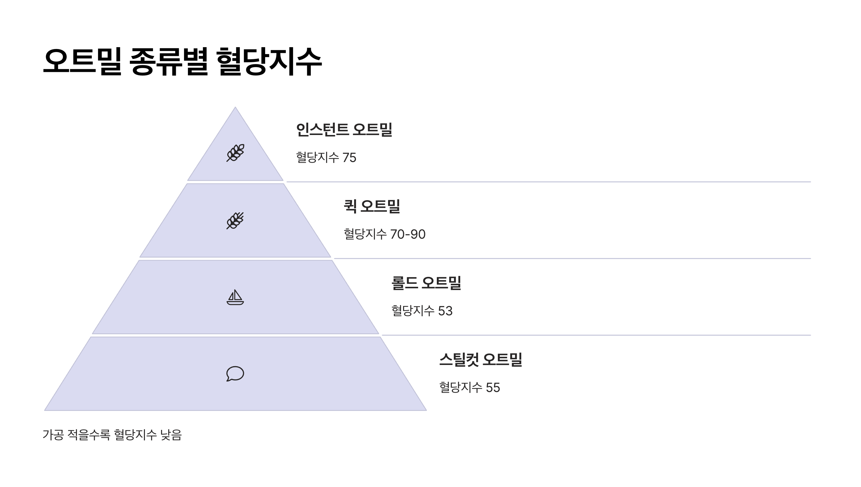 퀵 오트밀의 혈당지수가 롤드 오트밀보다 무려 40%나 높아요! 편의성을 위해 가공을 많이 할수록 혈당 관리에는 불리해지는 거죠.