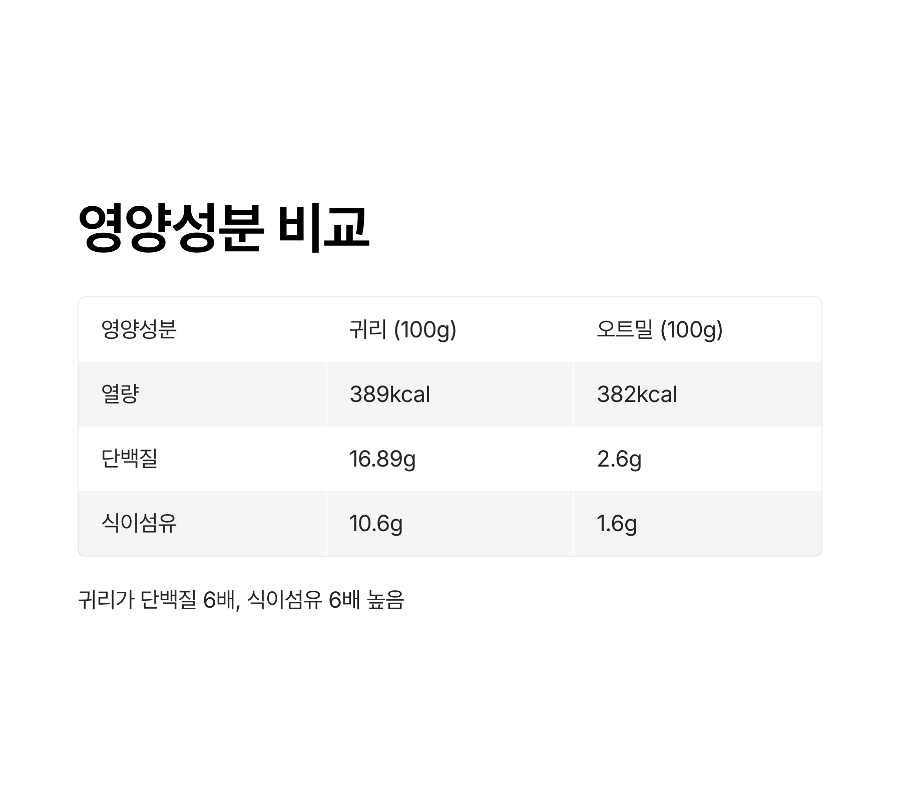 이 표를 보시면 정말 놀라실 거예요. 귀리가 오트밀보다 단백질은 무려