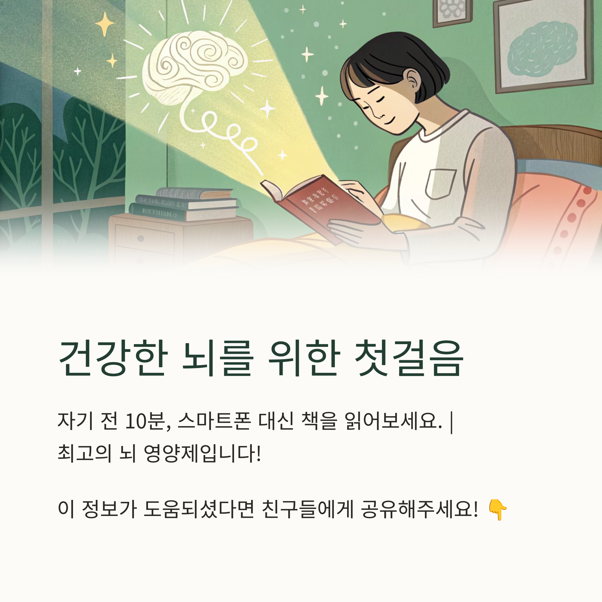💡 오늘부터 시작하기: 자기 전 10분, 스마트폰 대신 책을 읽어보세요. 뇌를 쉬게 하고 새로운 자극을 주는 것, 최고의 뇌 영양제랍니다!