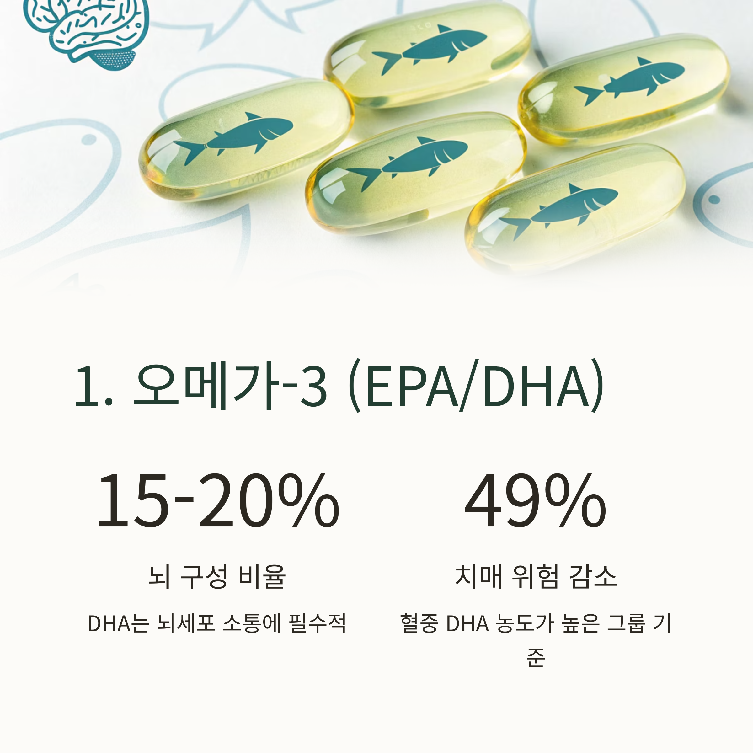 뇌 건강 영양제를 딱 하나만 꼽으라면 단연코 '오메가-3'입니다. 가장 강력하고 많은 과학적 근거를 가지고 있거든요. 특히