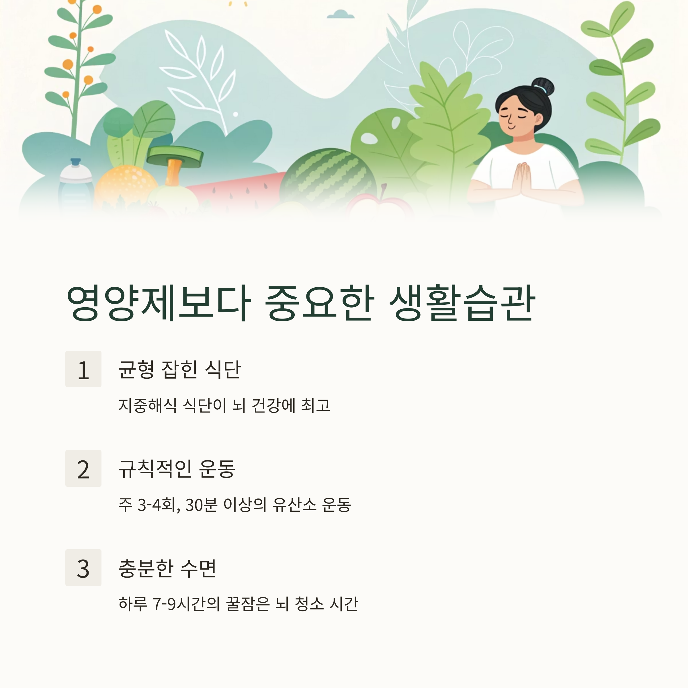 오늘 뇌 건강에 도움이 되는 5가지 핵심 영양제에 대해 알아보았습니다. 오메가-3부터 커큐민까지, 각 성분들이 과학적으로 어떻게 우리 뇌를 돕는지 이해하는 데 도움이 되셨으면 합니다. 하지만 가장 강조하고 싶은 것은, 영양제가 결코 건강한 생활 습관을 대체할 수 없다는 사실입니다. 영양제는 어디까지나 우리 뇌 건강을 위한 여정의 '든든한 조력자' 역할을 할 뿐입니다. 균형 잡힌 식단, 꾸준한 운동, 충분한 수면과 함께했을 때 비로소 이 영양제들의 진정한 가치가 발휘될 수 있다는 점을 꼭 기억해 주세요. 여러분의 총명하고 건강한 두뇌를 위한 꾸준한 노력, 저도 함께 응원하겠습니다!
