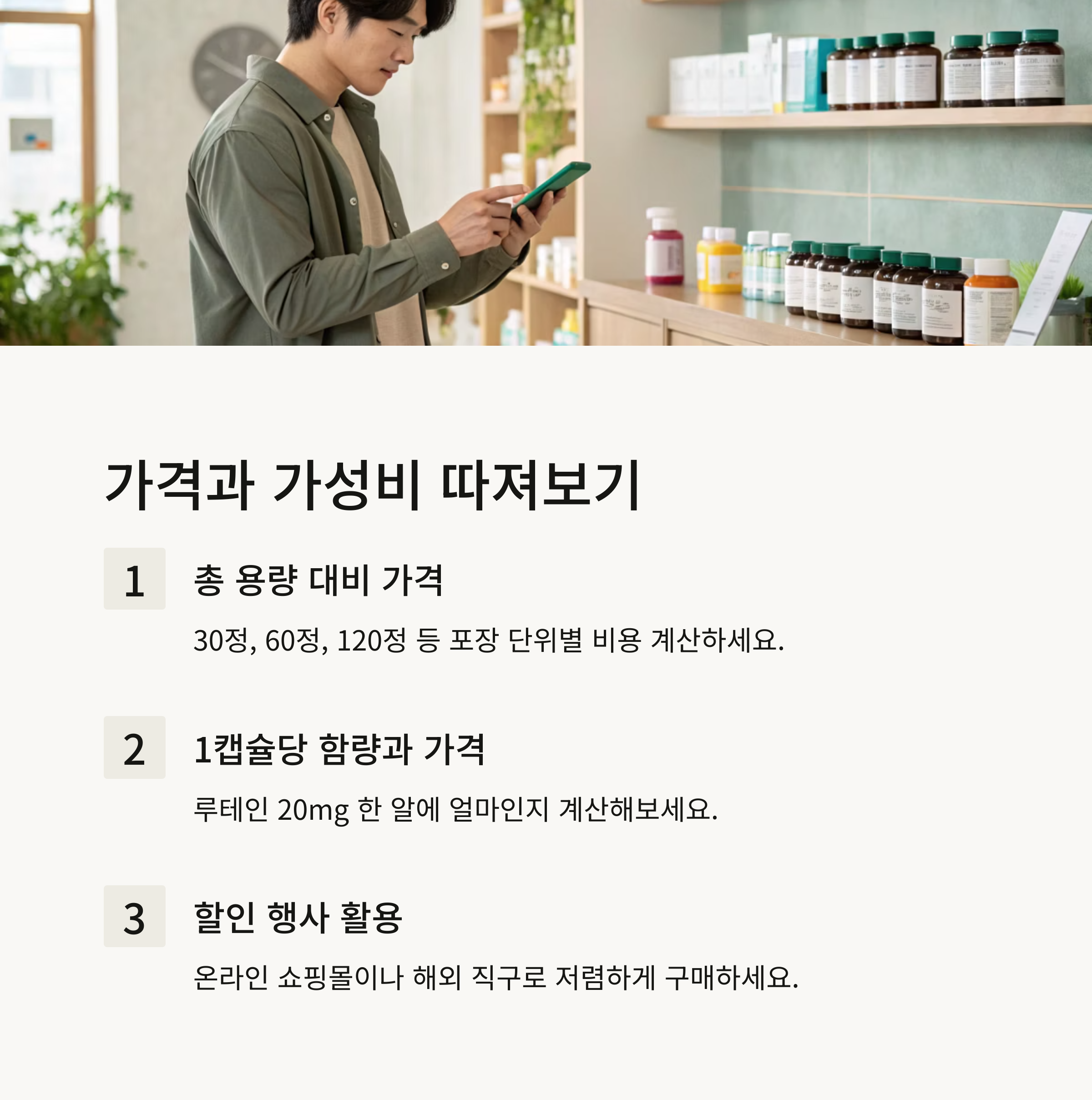 아무리 좋은 제품이라도 가격이 부담되면 꾸준히 섭취하기 어렵잖아요. 저는 인터넷 쇼핑몰을 운영해서 그런지, 어떤 제품이든 가성비를 꼼꼼히 따지는 습관이 있어요. 루테인도 마찬가지더라고요. 같은 함량인데도 제품마다 가격이 천차만별인 경우가 많았어요.
