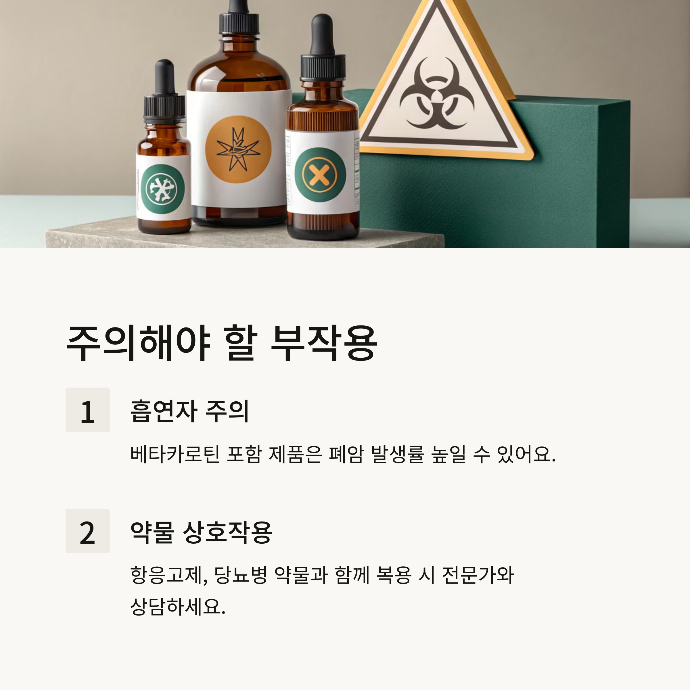 흡연자가 베타카로틴 성분이 포함된 루테인 복합제를 고용량으로 장기간 복용할 경우 폐암 발생률이 높아질 수 있다는 연구 결과가 있어요. 전자담배도 마찬가지니, 흡연자라면 베타카로틴이 없는 루테인 단일 제품이나 다른 복합 성분을 신중하게 선택해야 합니다.