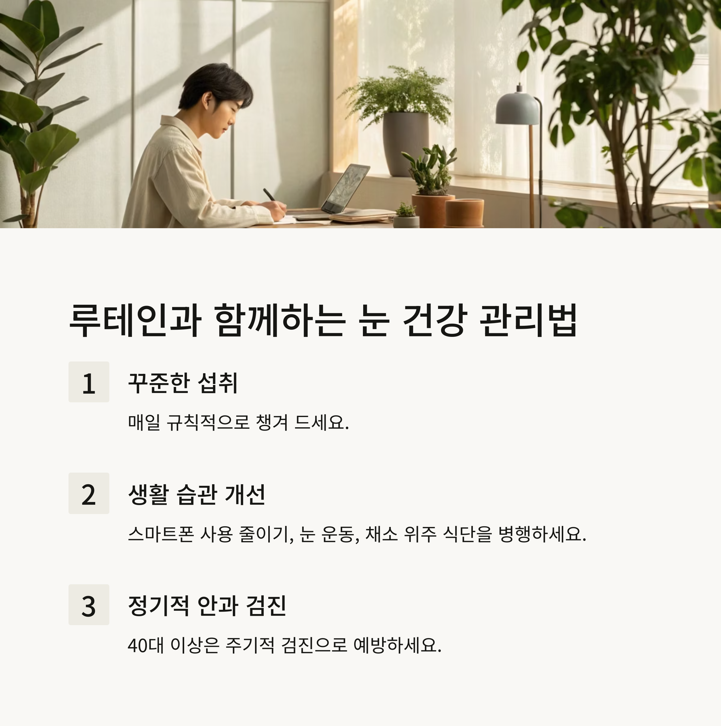 - 생활 습관 개선 병행: 루테인만 믿지 말고, 스마트폰 사용 시간 줄이기, 충분한 휴식, 눈 운동, 그리고 채소 위주의 건강한 식단 등 생활 습관 개선을 병행하는 것이 중요합니다.