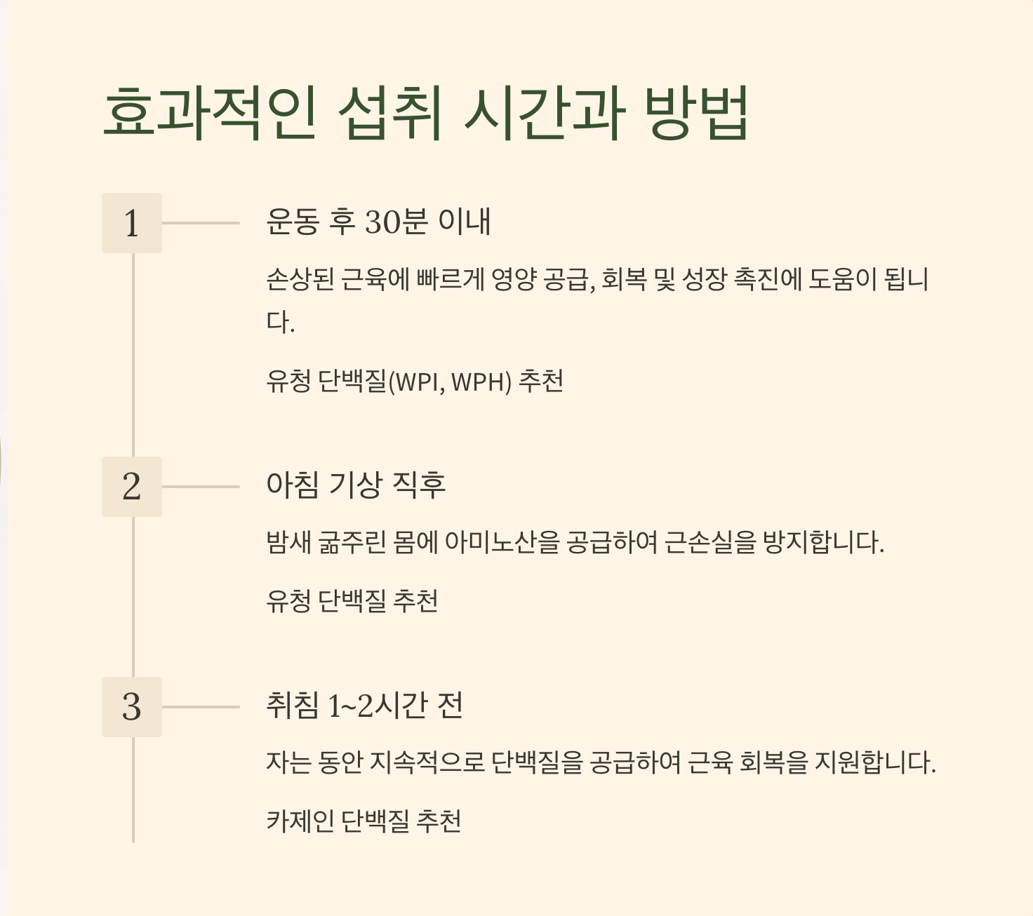 | 취침 1~2시간 전 | 자는 동안 지속적으로 단백질을 공급하여 근육 회복 지원 | 카제인 단백질 |