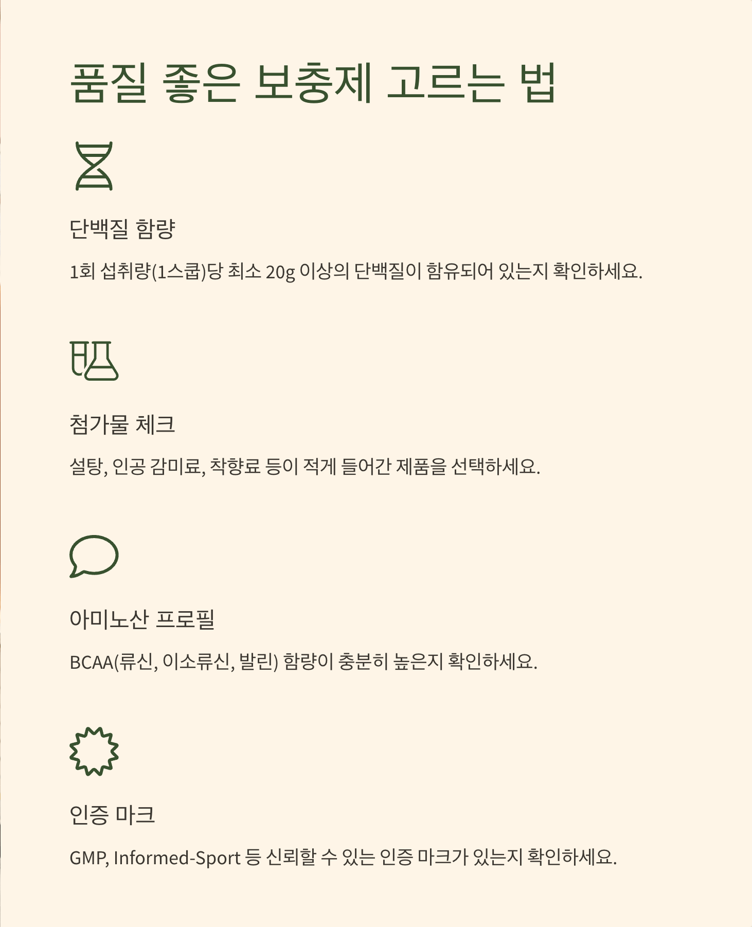 첫째, 단백질 함량을 보세요. 1회 섭취량(1스쿱) 당 실제 단백질이 최소 20g 이상은 되는지 확인해야 합니다. 둘째, 불필요한 첨가물이 있는지 체크! 설탕, 인공 감미료, 착향료 등이 너무 많이 들어간 제품은 피하는 게 좋아요. 셋째, 아미노산 프로필을 확인하세요. BCAA(류신, 이소류신, 발린) 함량이 충분히 높은지 보는 것이 좋습니다. 마지막으로, 신뢰할 수 있는 인증 마크(GMP, Informed-Sport 등)가 있는지 확인하면 더욱 안심하고 섭취할 수 있습니다. 조금 귀찮아도 이 과정이 내 몸을 지키는 길이에요!