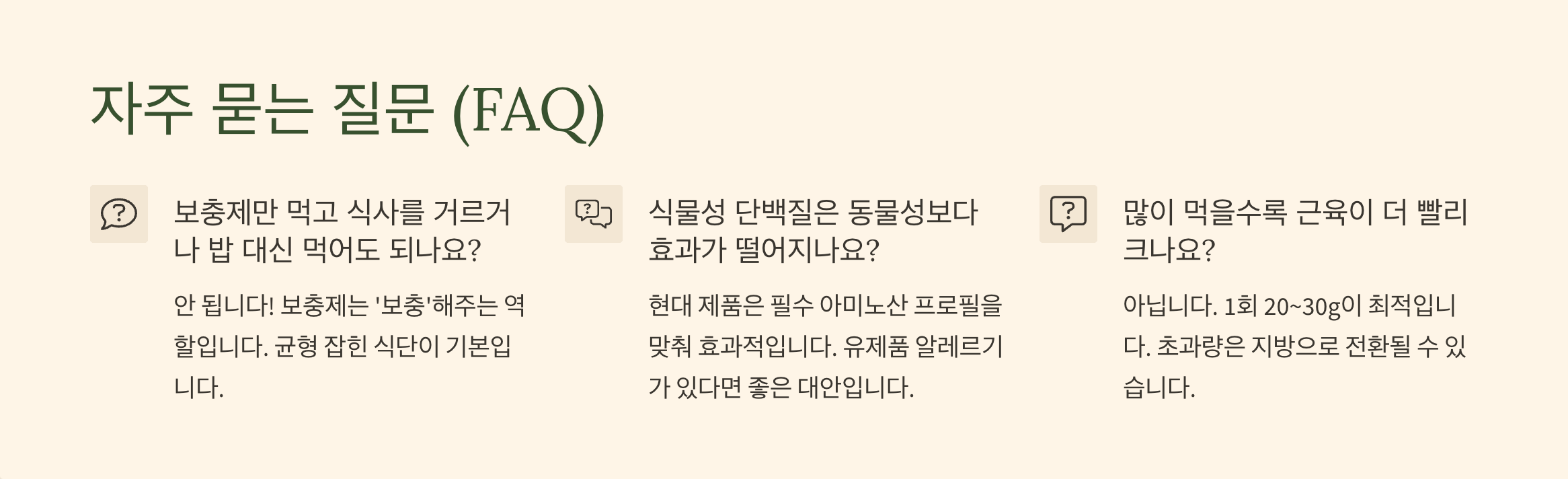 | 유청 단백질 (Whey) | 흡수가 빠른 '단거리 선수'. 근육 합성을 빠르게 촉진. (WPC/WPI/WPH) | 운동 직후, 아침 기상 직후 |