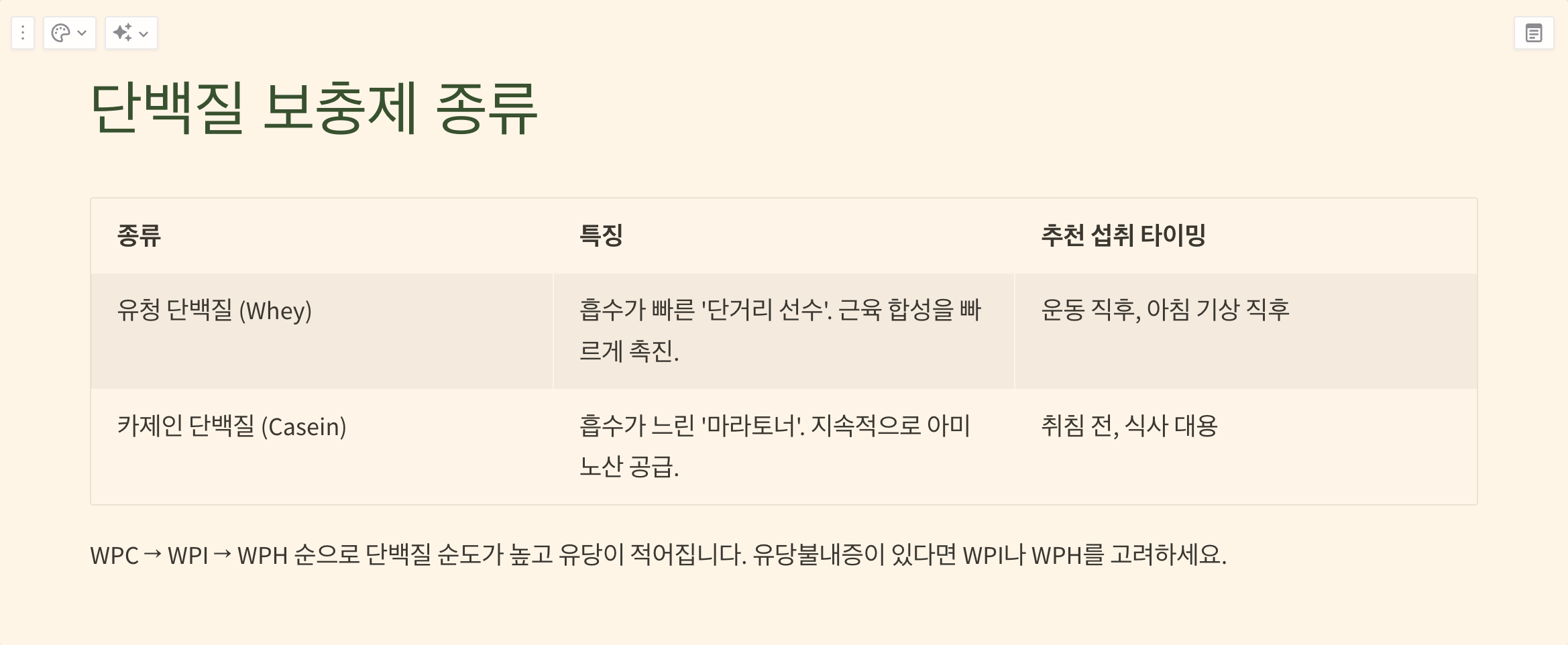 | 유청 단백질 (Whey) | 흡수가 빠른 '단거리 선수'. 근육 합성을 빠르게 촉진. (WPC/WPI/WPH) | 운동 직후, 아침 기상 직후 |