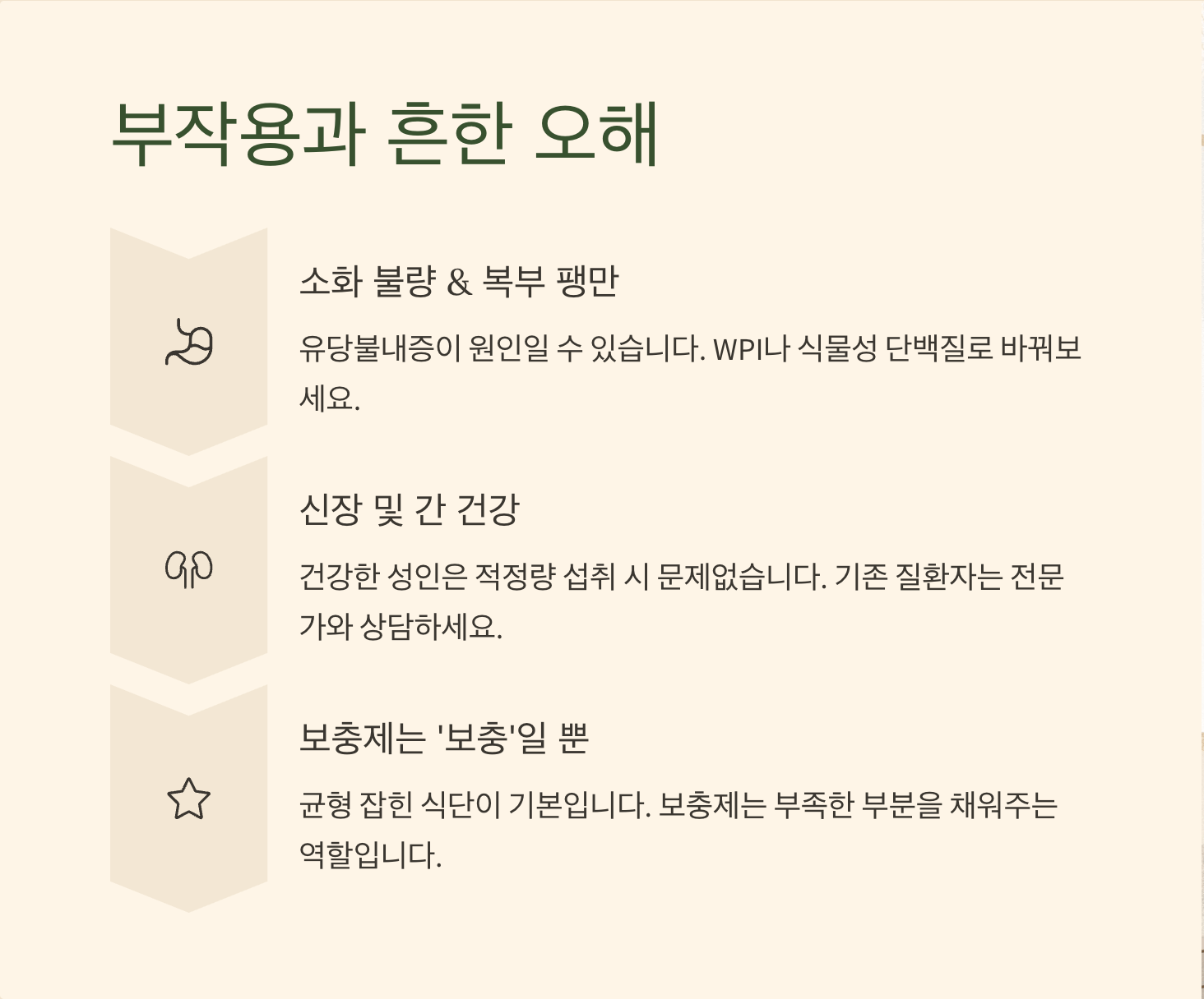 "단백질 보충제 먹으면 신장 나빠진다던데?", "살찐다던데?" 이런 말들 들어보셨죠? 대부분은 오해이거나 잘못된 섭취 방법 때문이에요. 몇 가지만 주의하면 안전하게 섭취할 수 있습니다.