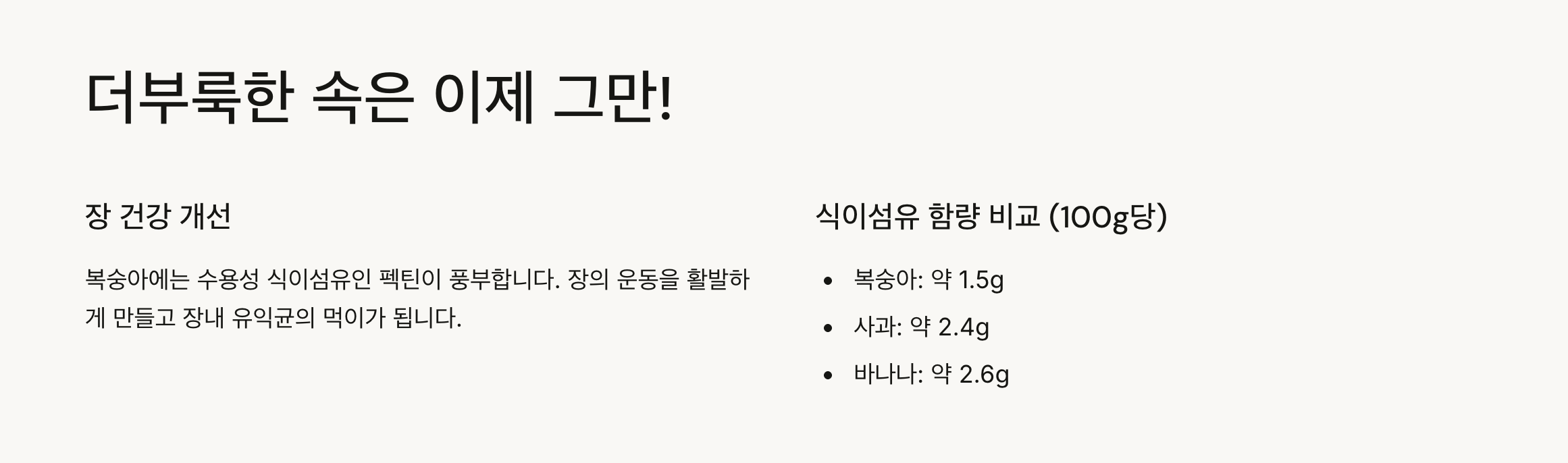 | 복숭아 | 약 1.5g | 펙틴 풍부, 장 운동 촉진 |
