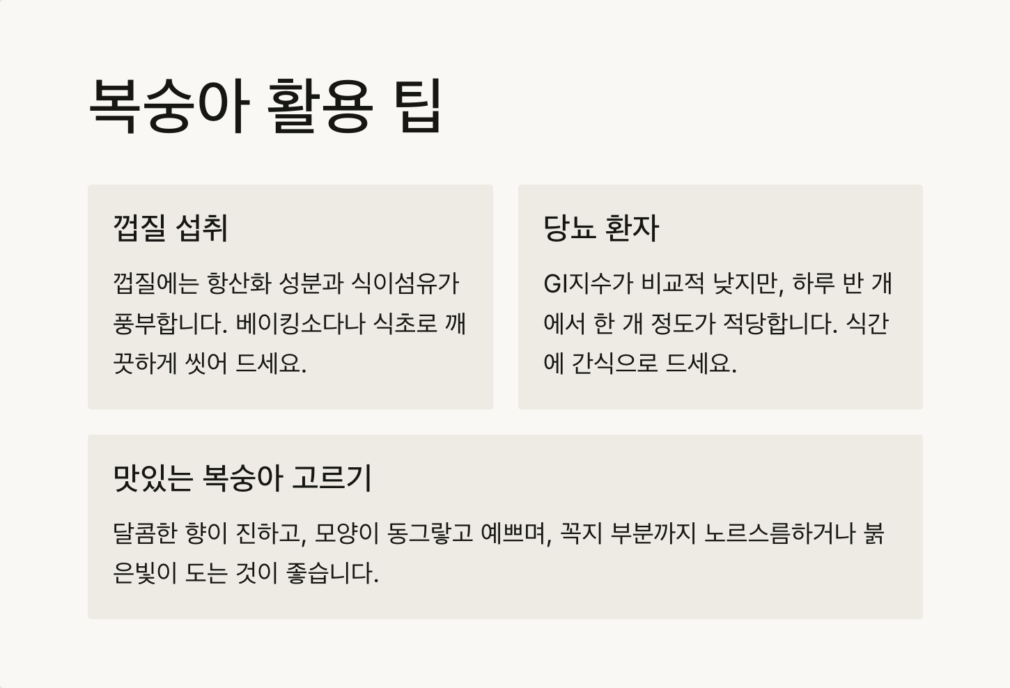 | 복숭아 | 약 1.5g | 펙틴 풍부, 장 운동 촉진 |