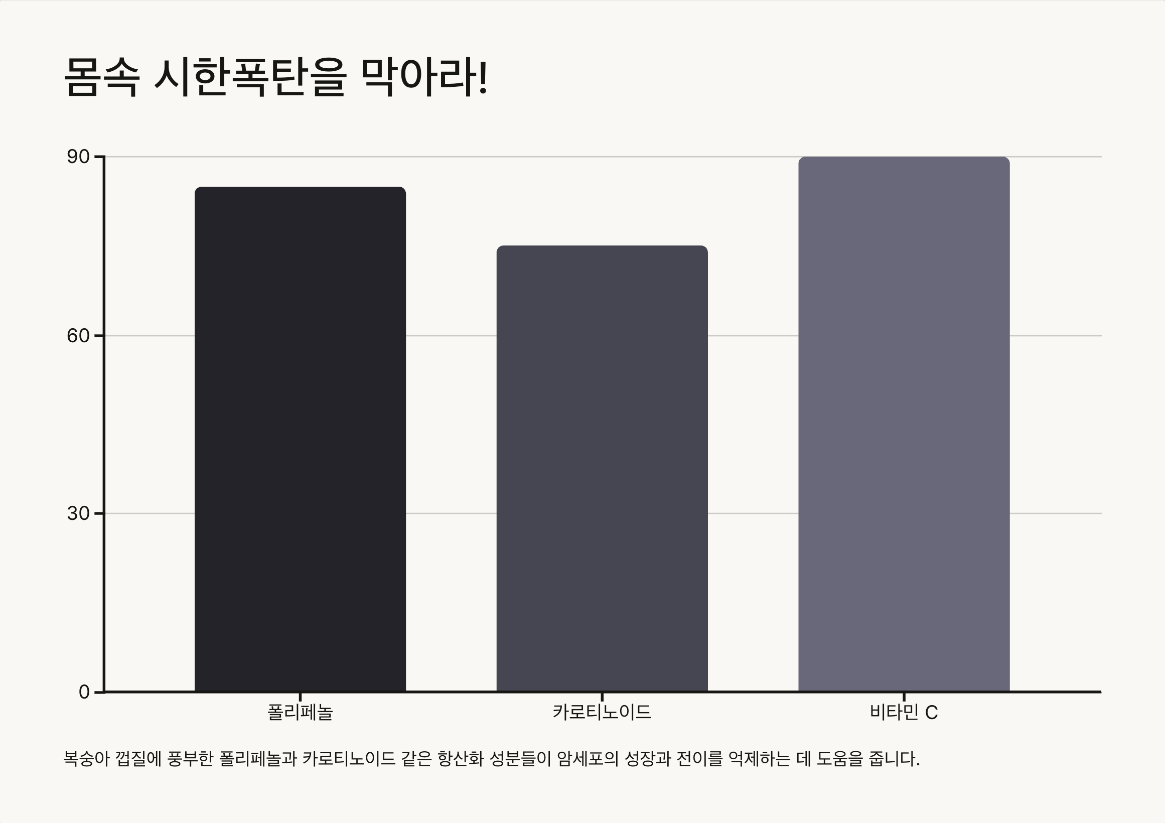 사실 '암'이라는 단어는 듣기만 해도 무섭죠. 저도 여러 만성질환을 앓고 있다 보니 건강에 대한 염려가 클 수밖에 없는데요. 복숭아에 항암 효과가 있다는 연구 결과들을 보면 조금이나마 마음이 놓이는 것 같아요. 복숭아 껍질에 풍부한 폴리페놀과 카로티노이드 같은 항산화 성분들이 암세포의 성장과 전이를 억제하는 데 도움을 줄 수 있다고 합니다. 물론 복숭아가 암 치료제는 아니지만, 꾸준히 섭취하면 암 예방에 긍정적인 영향을 줄 수 있다는 거죠. 아래 표에서 복숭아의 주요 항산화 성분과 그 기능을 확인해보세요.
