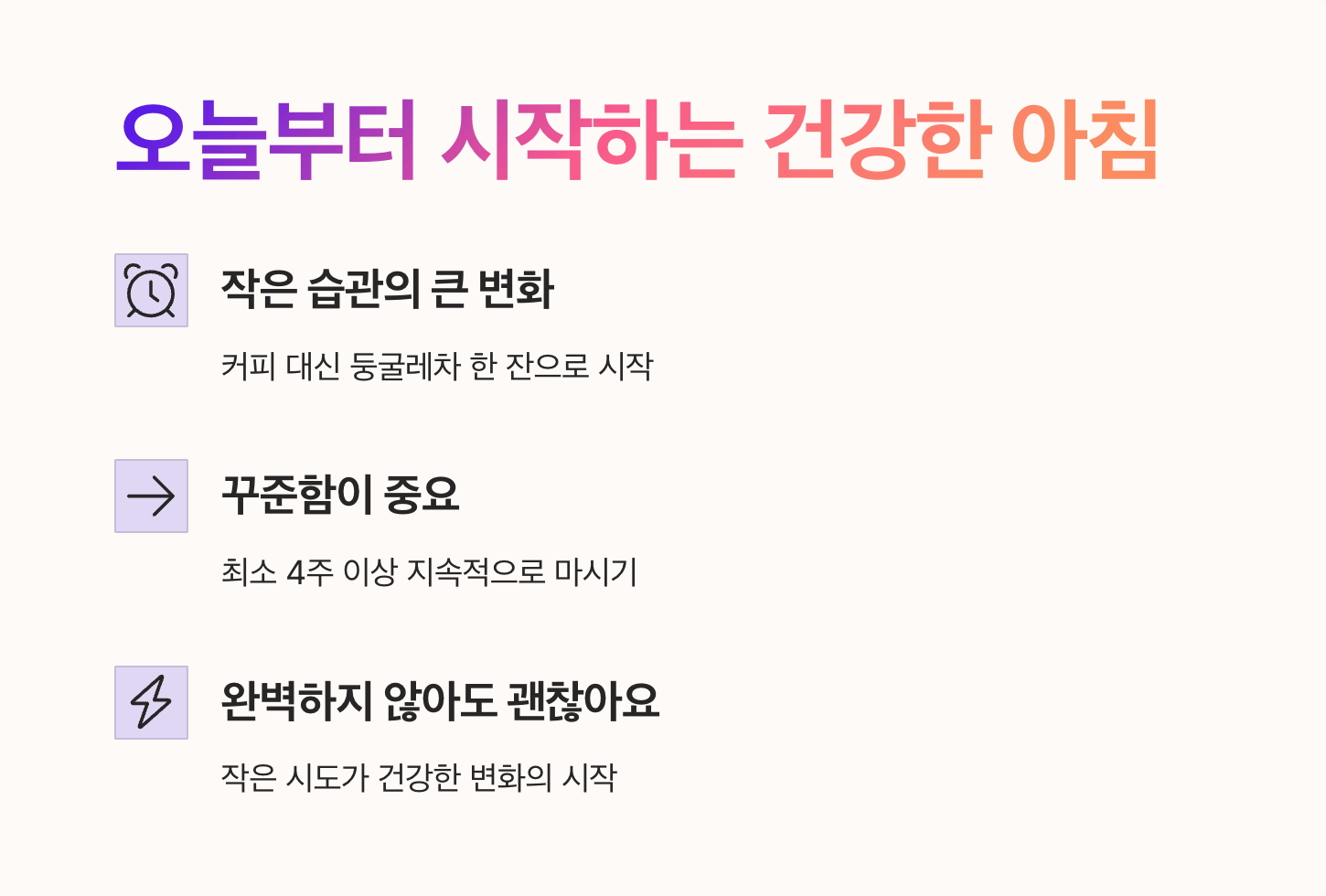 - 적절한 양: 하루 2~3잔 정도가 적당하며, 아침에 한 잔으로 시작해보세요.