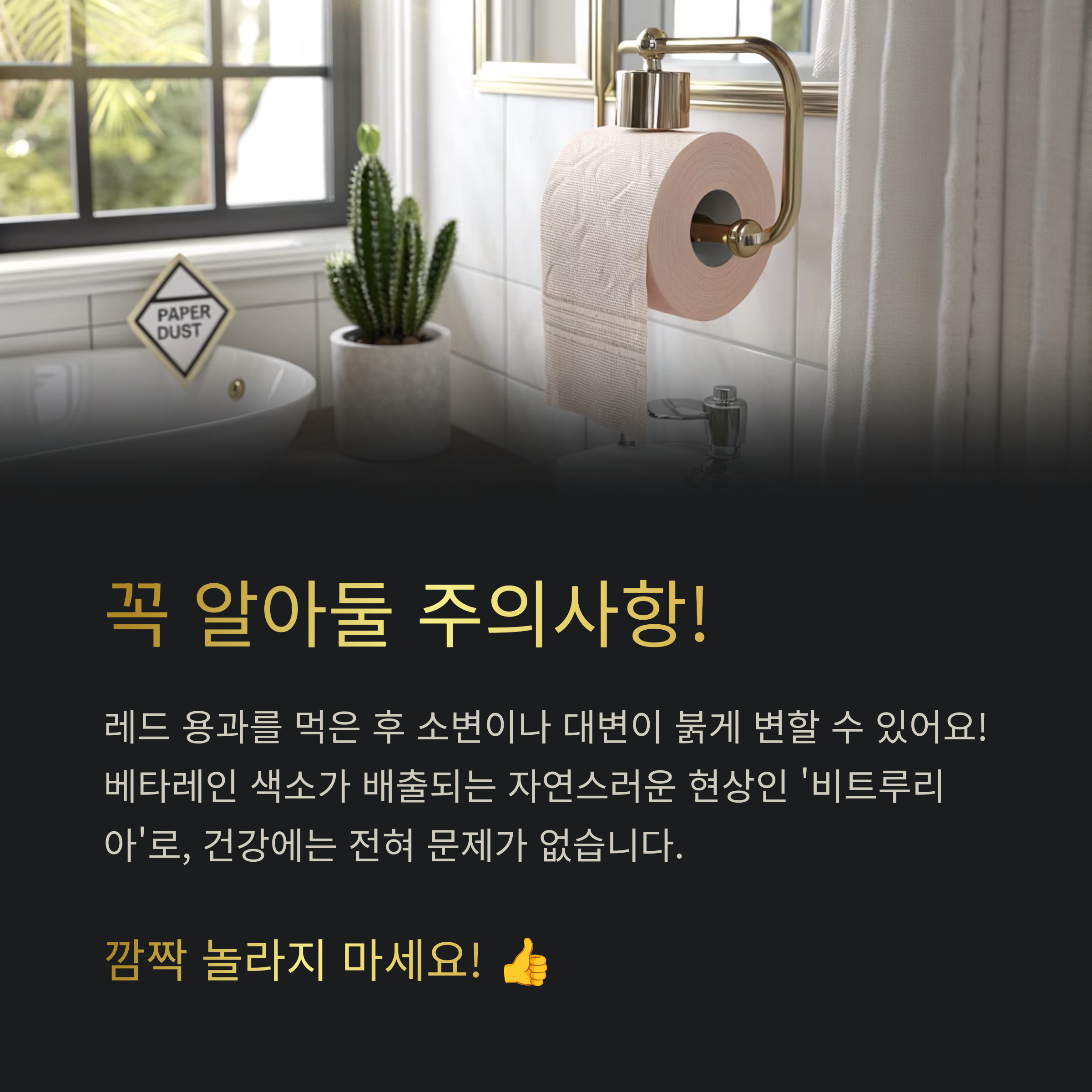 레드 용과를 먹고 나서 소변이나 대변이 붉은색으로 나와서 깜짝 놀라실 수 있어요! 이건 '비트루리아'라는 현상으로, 베타레인 색소가 몸 밖으로 배출되는 자연스러운 과정이니 전혀 걱정하지 않으셔도 됩니다. 건강에는 아무런 해가 없어요!