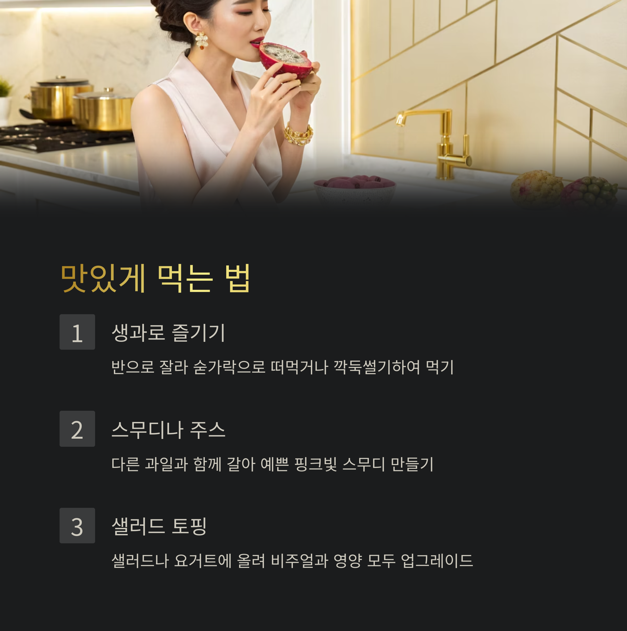 레드 용과는 그냥 먹어도 좋지만, 화려한 색감을 활용하면 더 다양하게 즐길 수 있어요. 먹는 법은 아주 간단해요. 그리고 먹기 전에 딱 한 가지만 알아두시면 좋은 주의사항이 있답니다.