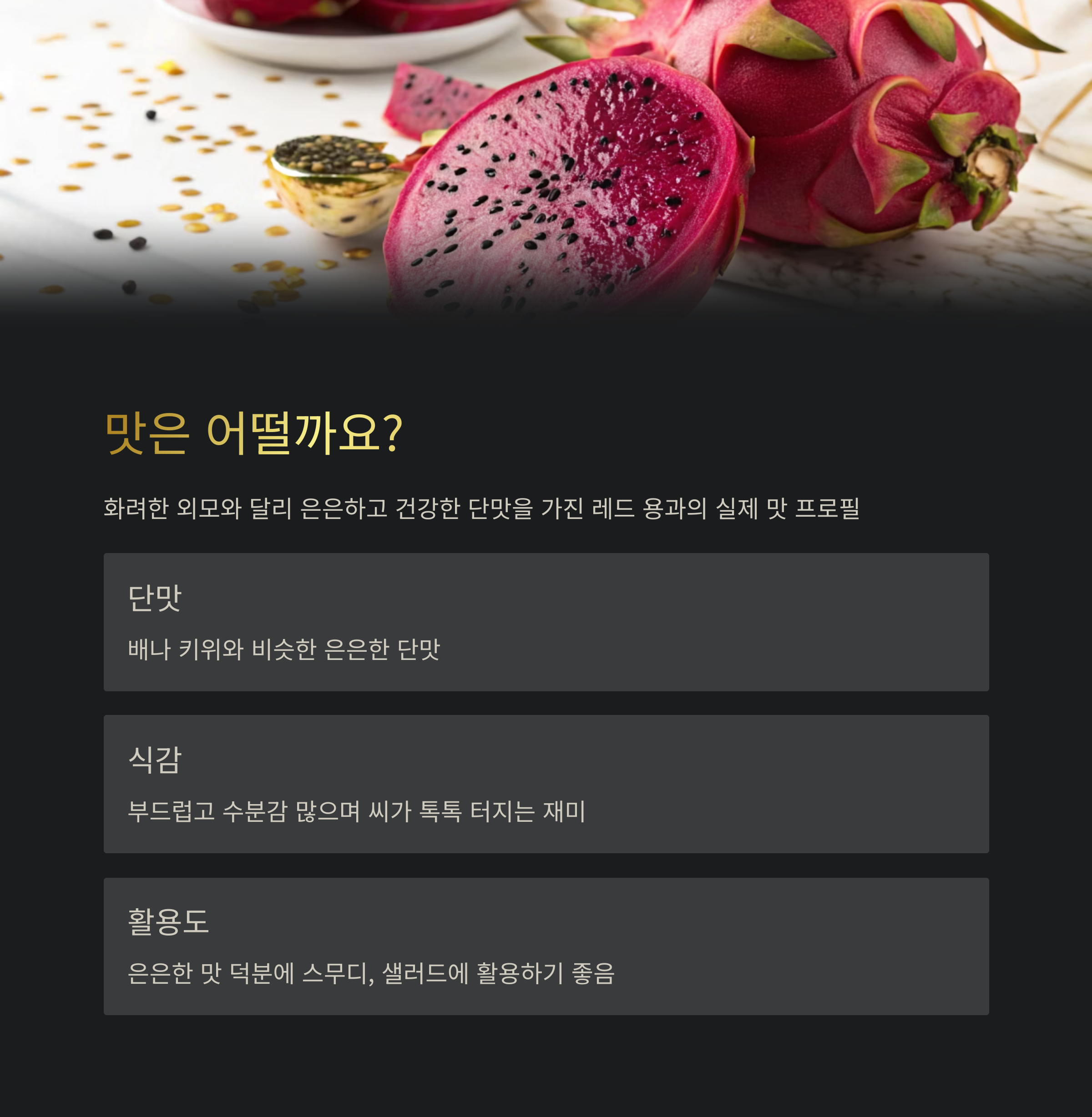 A 네, '압도적인 단맛'을 기대하셨다면 밍밍하다고 느낄 수 있어요. 하지만 잘 익은 레드 용과는 배나 키위 정도의 은은한 단맛과 부드러운 식감을 가지고 있어 매력적이랍니다. 자극적이지 않아 다른 음식과 잘 어울리는 것이 장점이에요.