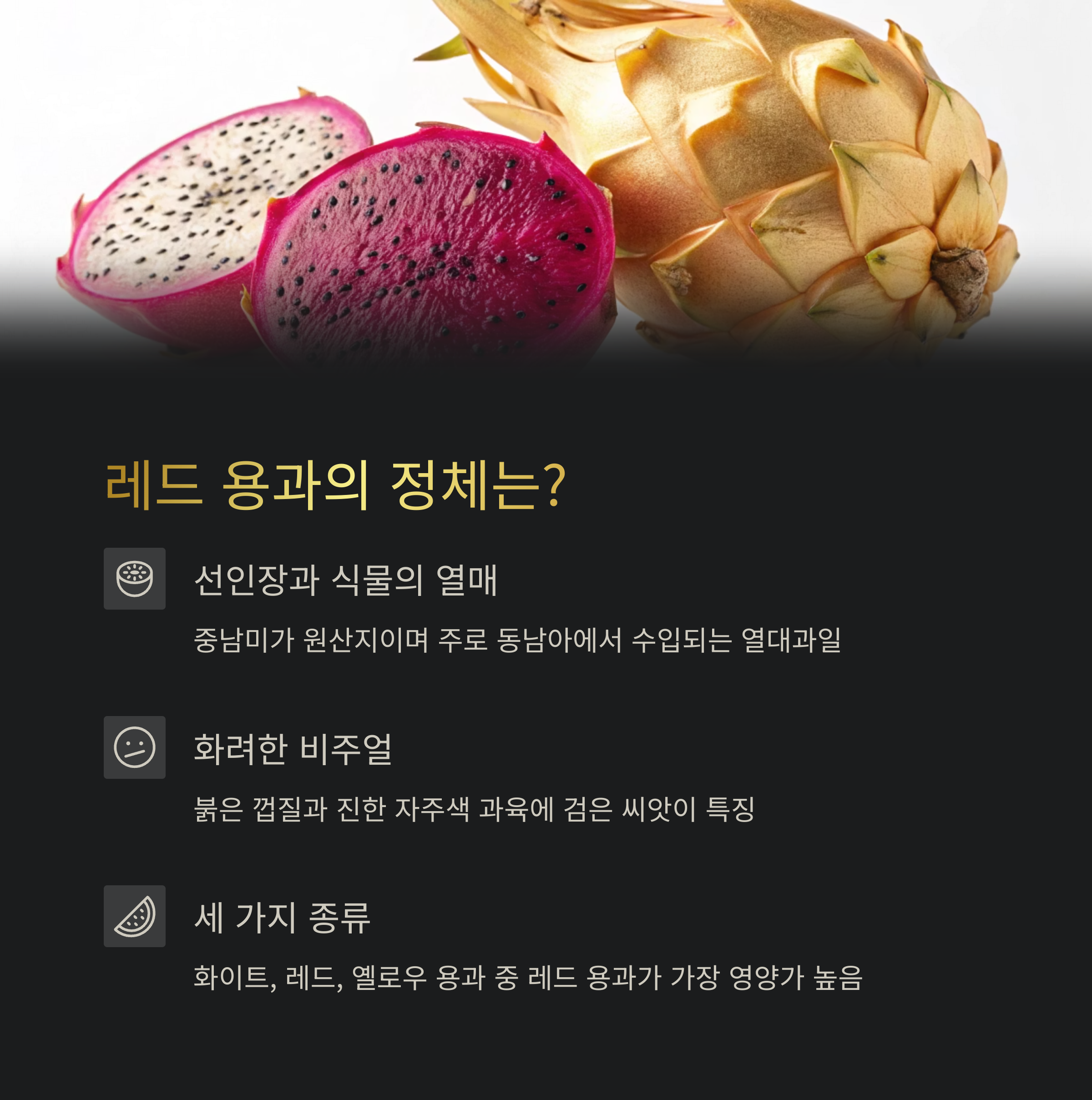 💡 오늘부터 시작하기: 레드 용과를 고를 땐 껍질이 선명하고 상처가 없으며, 살짝 눌렀을 때 단단한 것을 고르세요. 너무 무르면 과숙된 것이랍니다!
