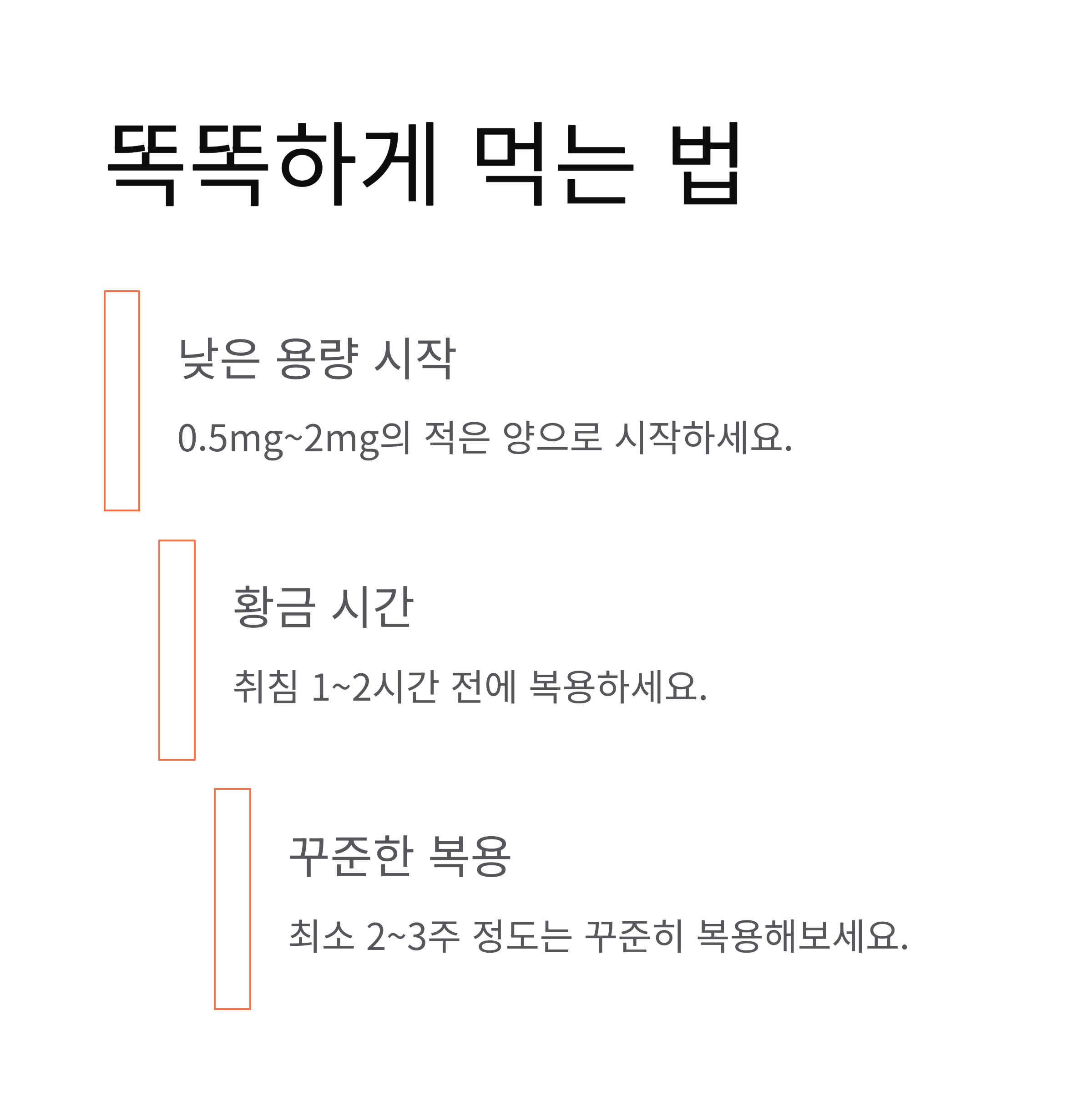 - 가장 낮은 용량부터 시작하세요: 처음에는 0.5mg ~ 2mg 정도의 아주 적은 양으로 시작해서 내 몸의 반응을 살펴보는 것이 안전합니다.