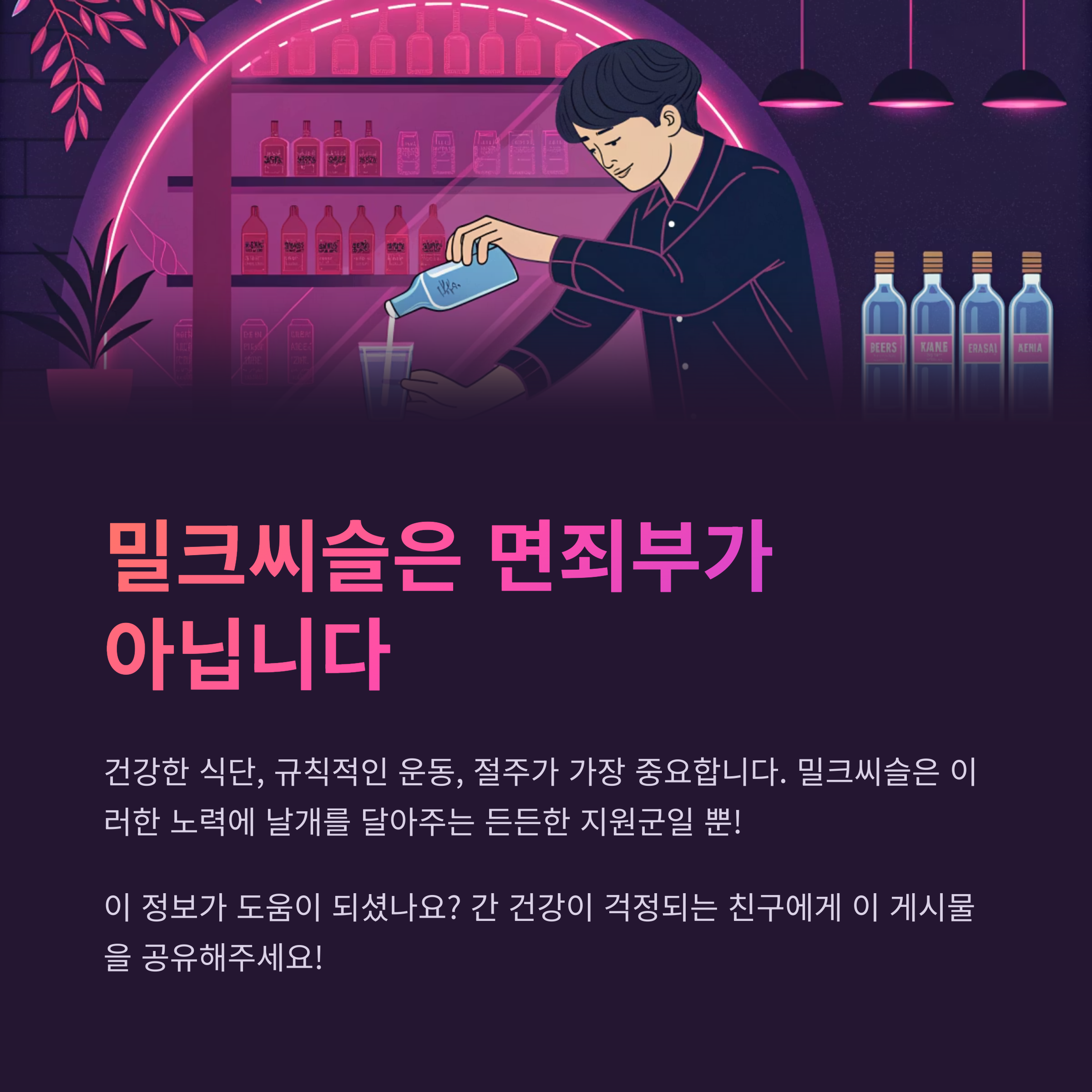 💡 오늘부터 시작하기: 오늘 저녁 술 약속이 있으신가요? 딱 한 잔만 덜 마셔보세요. 작은 실천 하나가 밀크씨슬 영양제 한 통보다 더 큰 효과를 가져올 수 있답니다!