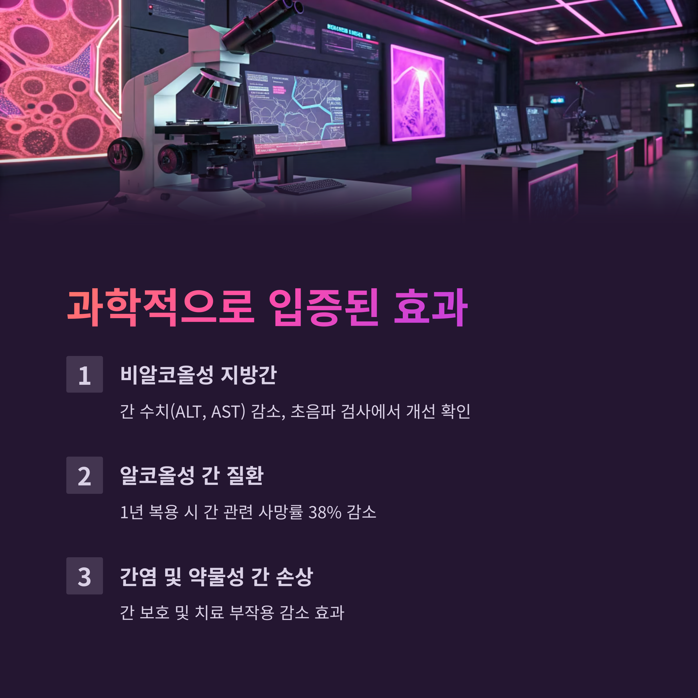 - 바이러스성 간염 및 약물성 간 손상: 바이러스를 직접 없애지는 못하지만, 항바이러스 치료와 함께 복용했을 때 간을 보호하고 치료 부작용을 줄여주는 효과가 있었습니다. 특정 약물로 인한 간 손상을 예방하는 효과도 입증되었고요.