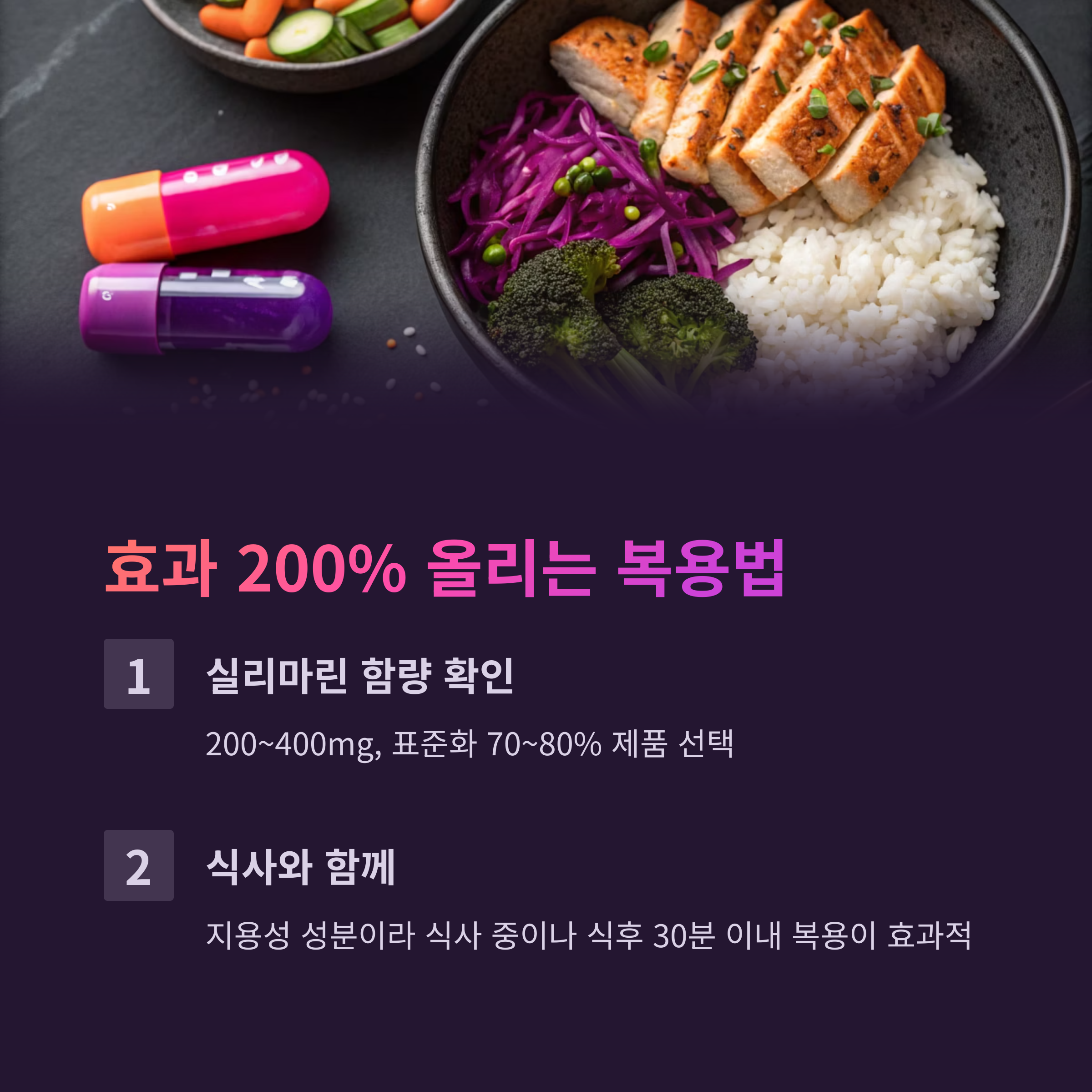 | 실리마린 70~80% 표준화 제품 선택 | 단순 밀크씨슬 분말 제품 |