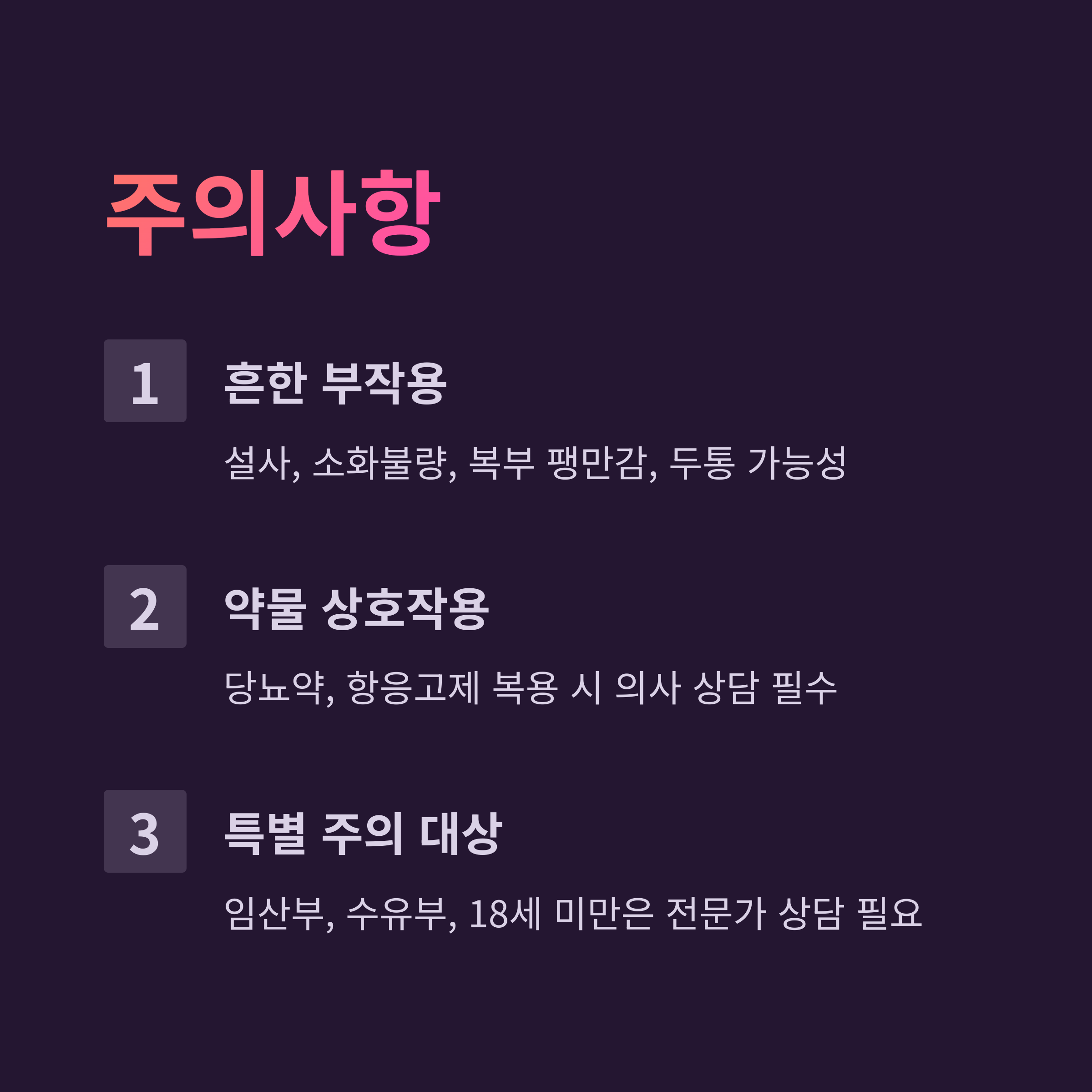 - 흔한 부작용: 드물게 설사, 소화불량, 복부 팽만감 같은 위장 장애나 두통이 나타날 수 있어요. 대부분은 복용을 중단하면 사라집니다.