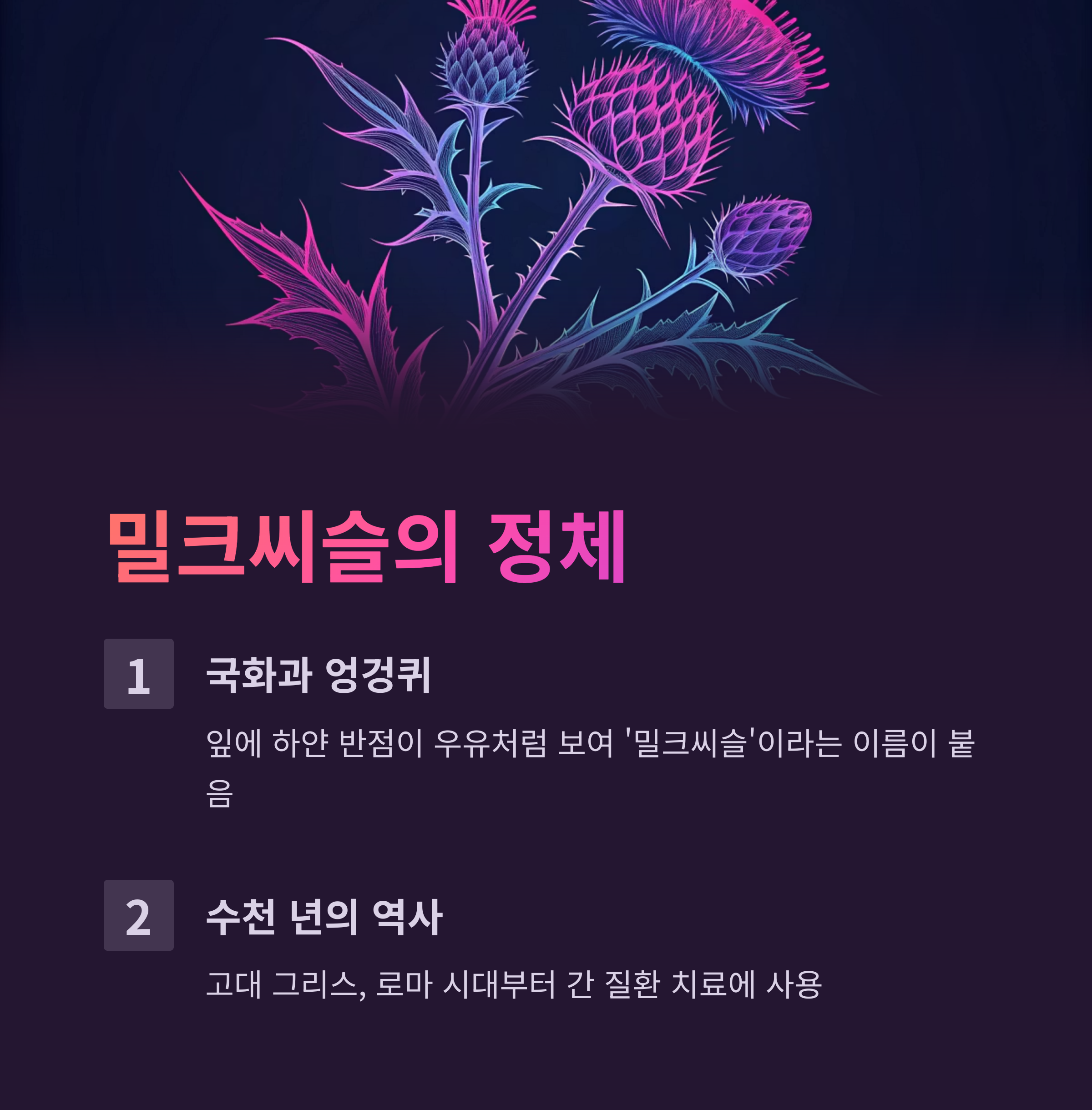 밀크씨슬은 사실 '엉겅퀴'라고 불리는 국화과 식물의 한 종류예요. 잎사귀에 하얀 반점이 꼭 우유를 떨어뜨린 것 같다고 해서 '밀크'씨슬이라는 예쁜 이름이 붙었죠. 이 식물의 역사는 정말 어마어마한데요, 무려 고대 그리스, 로마 시대부터 간 질환 치료에 사용되었다는 기록이 있을 정도예요. 수천 년 동안 인류가 간 건강을 위해 애용해 온, 그야말로 '역사가 증명하는' 천연 간 보호제라고 할 수 있습니다. 동의보감 같은 우리 전통 의학서에도 비슷한 엉겅퀴의 효능이 기록되어 있을 만큼 동서양을 막론하고 그 가치를 인정받아 왔답니다.