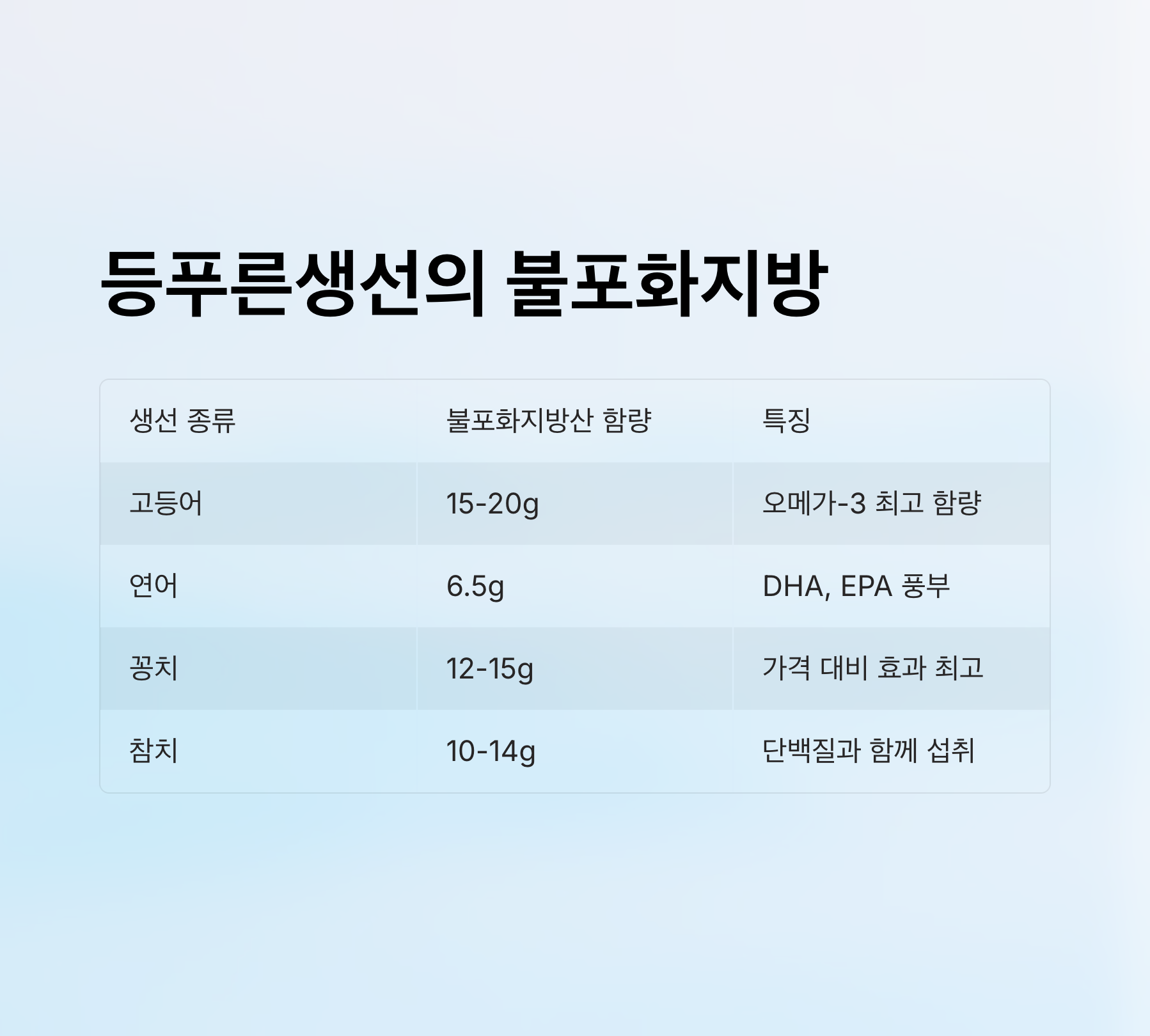 | 생선 종류 | 1회 제공량(100g) | 불포화지방산 함량 | 특징 |