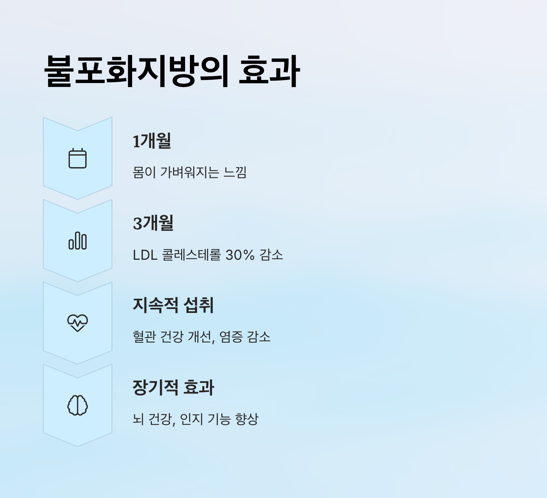 | 혈중 중성지질 개선 | 500~2,000mg | 3개월 후 혈액검사 개선 | 고등어 주 2회 |