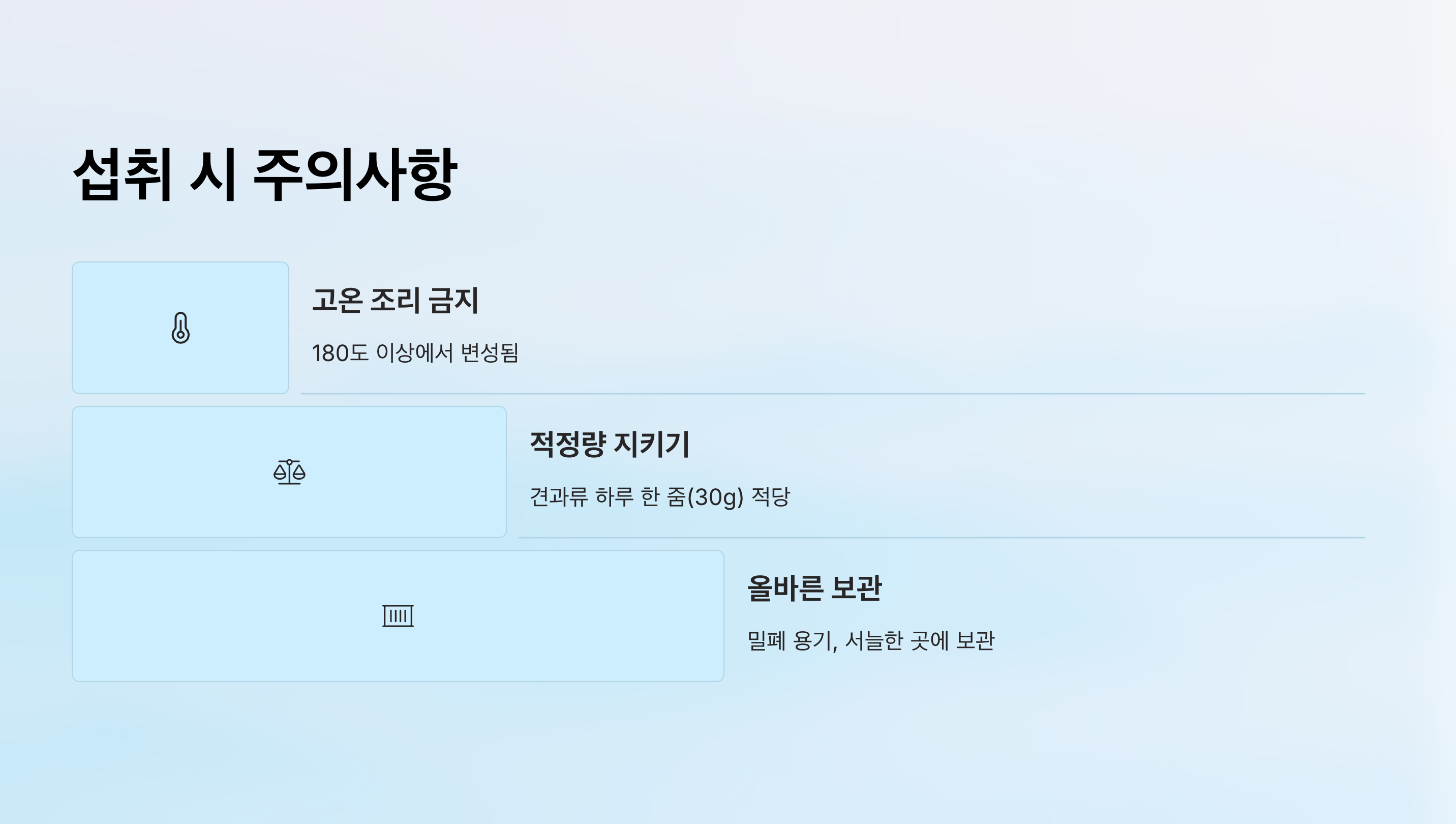 - 보관법 주의 - 견과류는 밀폐 용기에, 오일은 서늘한 곳에 보관해야 해요.