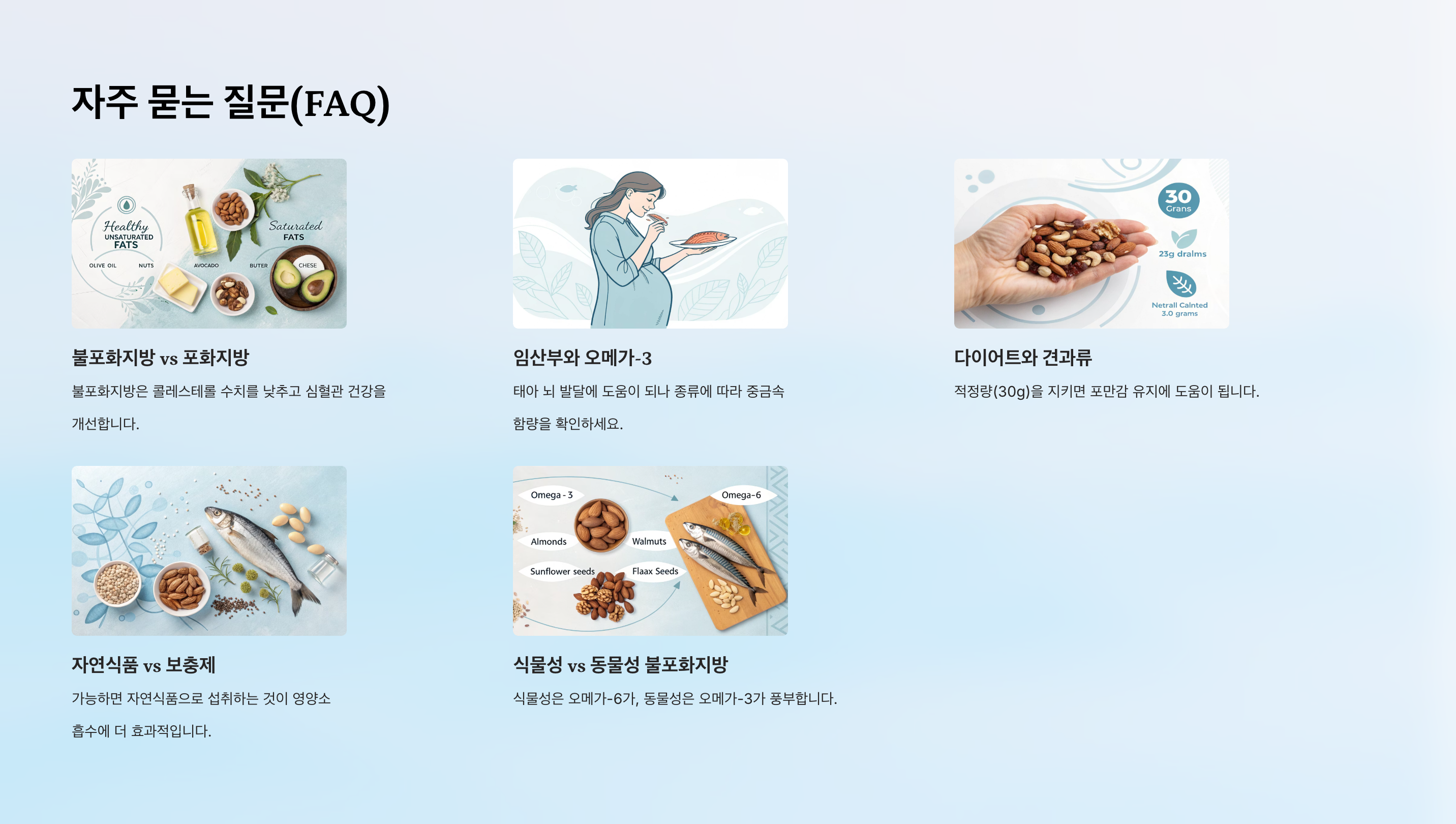 - 균형 잡힌 섭취 - 오메가-3와 오메가-6의 비율이 1:4 정도가 이상적이래요.