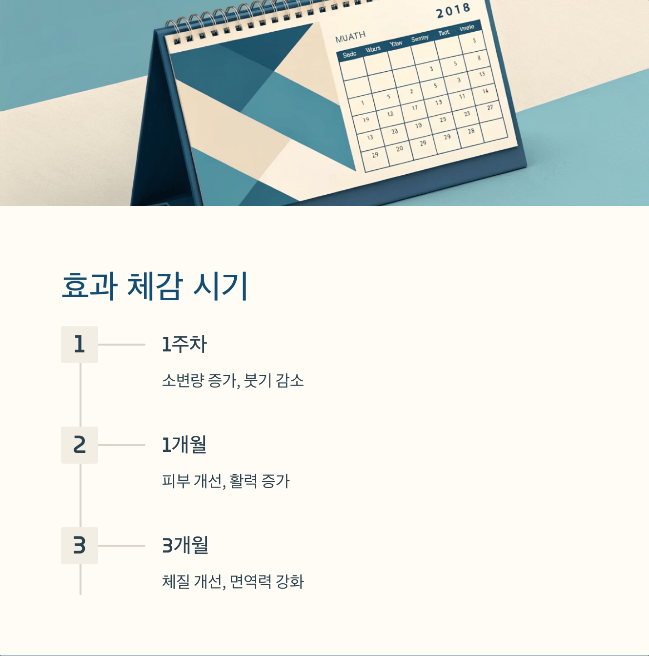 A 개인차가 있지만 보통 꾸준히 1~3개월 정도 드시면 몸의 긍정적인 변화를 느끼기 시작합니다. 단기적인 효과보다는 체질 개선을 목표로 장기적으로 드시는 것이 좋습니다.