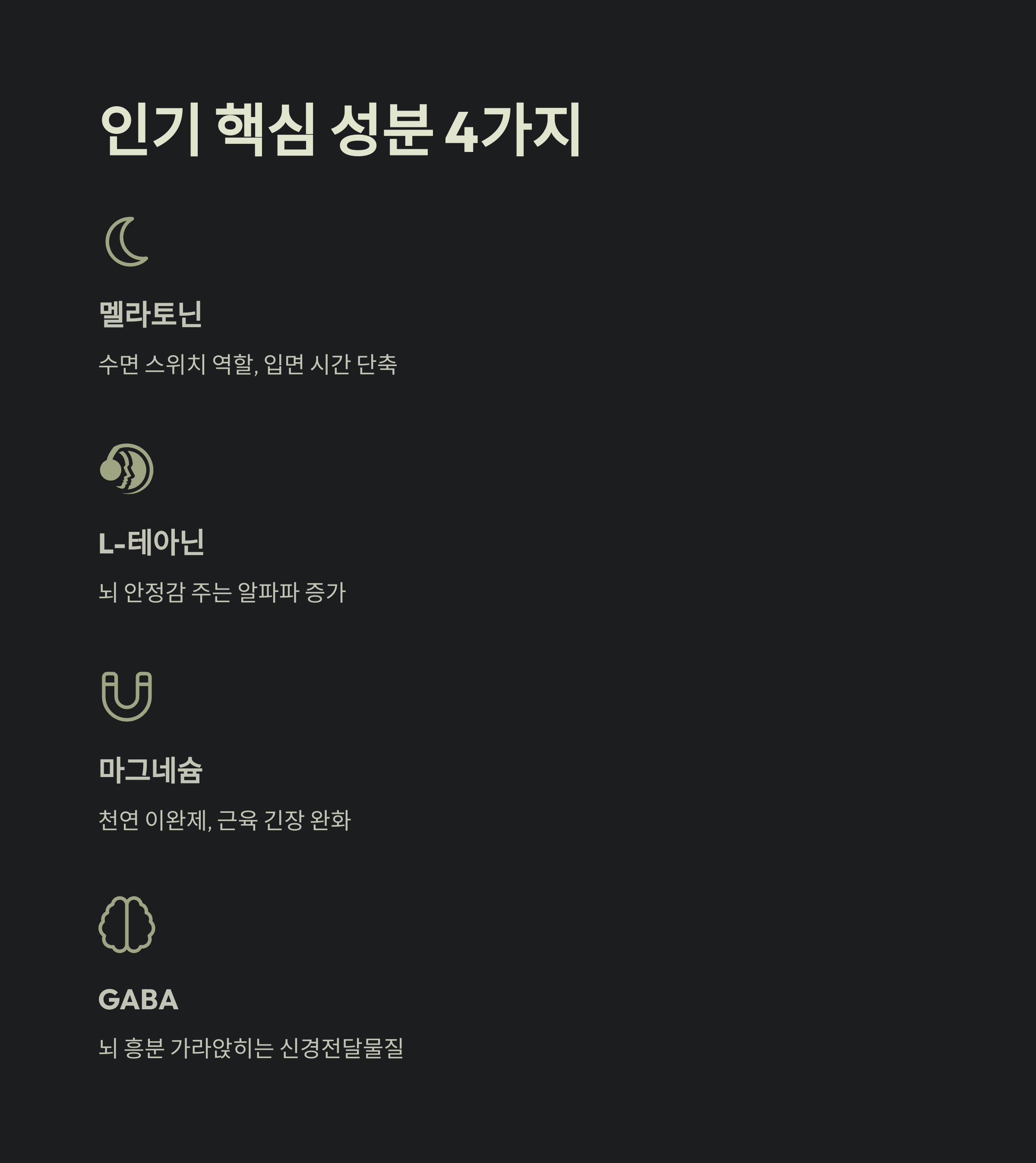 위 표에 나온 성분들 중에서도 특히 많이 사용되고 효과가 검증된 핵심 성분들이 있습니다. 이 네 가지만 알아도 수면 보조제 선택이 훨씬 쉬워질 거예요.