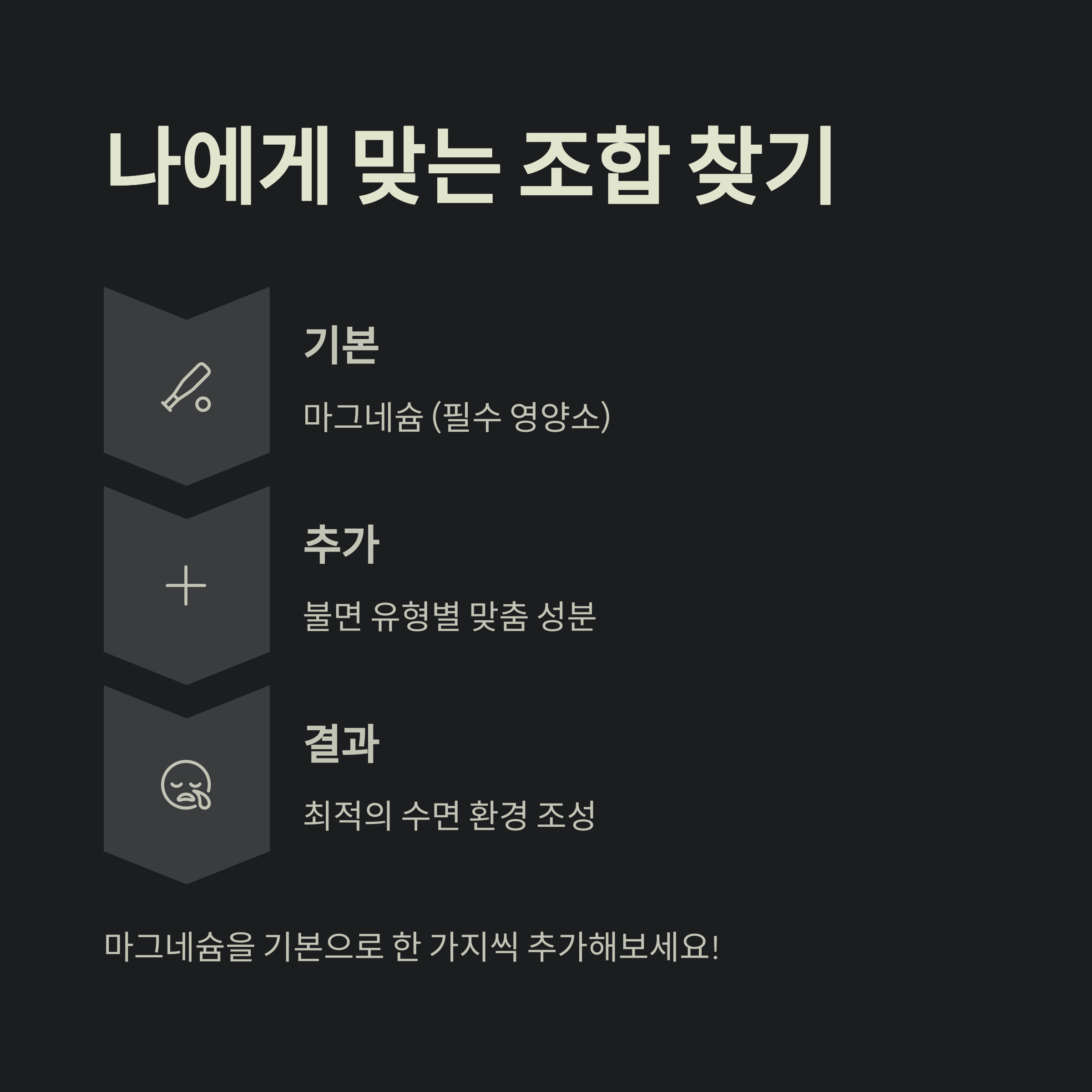 전문가들은 수면 보조제를 처음 시도한다면 **마그네슘**을 기본으로 시작해 보길 권장합니다. 마그네슘은 필수 영양소라 안전하고, 신경 안정과 근육 이완 등 수면의 기본 환경을 만드는 데 큰 도움을 주기 때문입니다. 여기에 자신의 불면 유형에 맞는 성분을 하나씩 추가하며 최적의 조합을 찾아가는 것이 좋습니다. 예를 들어,