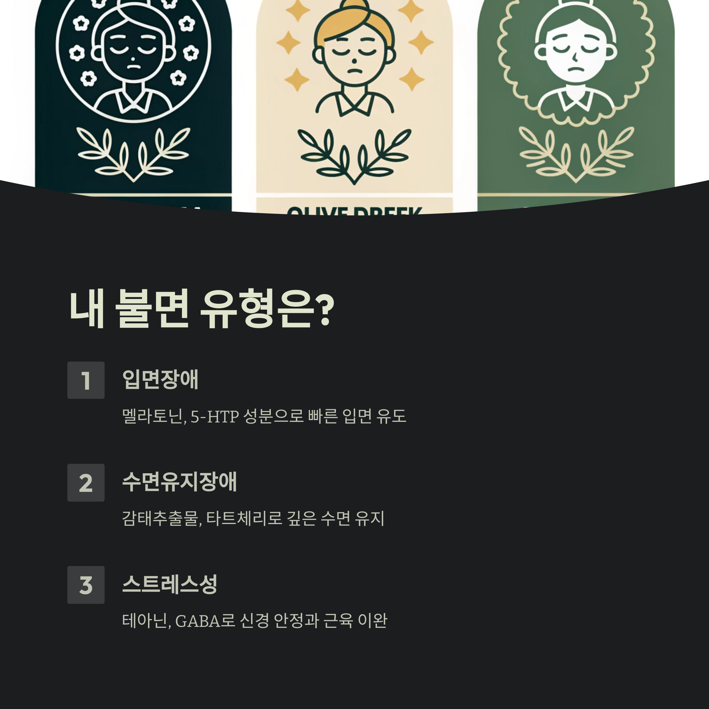 수면 보조제를 고를 때 가장 먼저 해야 할 일은 '나의 수면 문제가 무엇인가'를 파악하는 것입니다. 잠드는 것 자체가 어려운지, 자다가 자주 깨는지, 아니면 스트레스 때문에 잠을 설치는지에 따라 필요한 성분이 다르기 때문이죠.