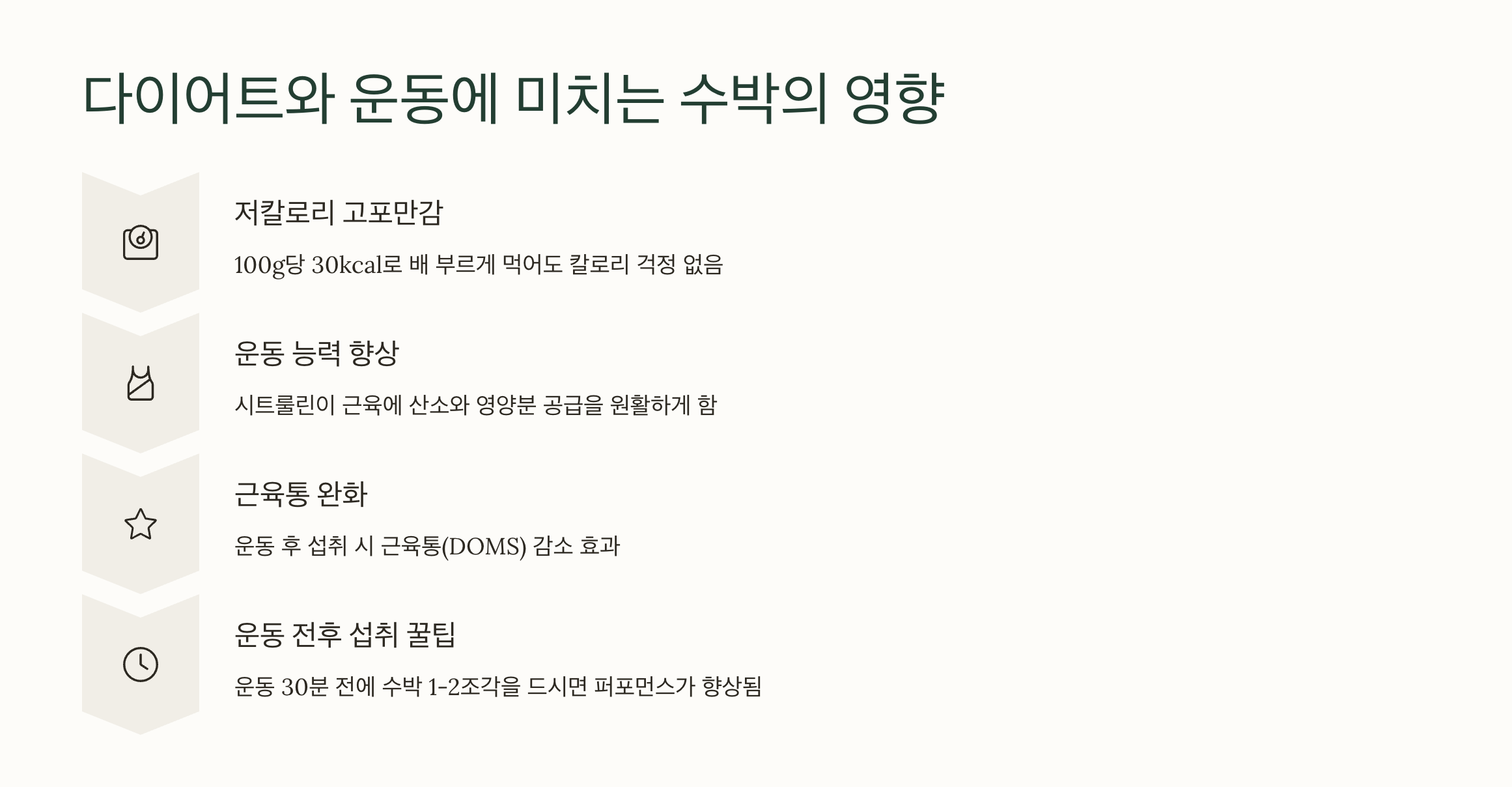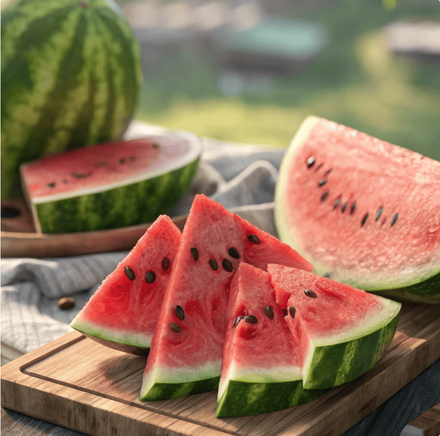 운동 30분 전에 수박 1-2조각을 드시면 혈류량 증가로 퍼포먼스가 향상되고, 운동 후에는 근육 회복과 수분 보충에 도움이 됩니다!