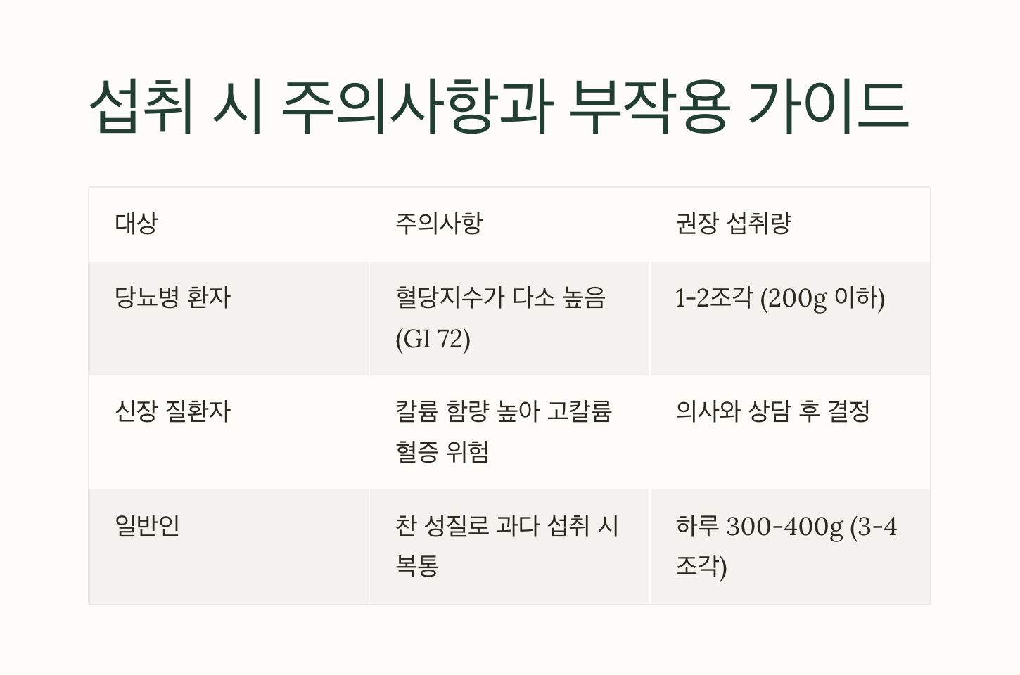 | 일반인 | 찬 성질로 과다 섭취 시 복통 | 하루 300-400g (3-4조각) |