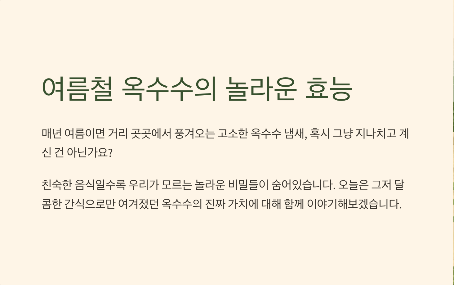 안녕하세요, 여러분! 건강 블로그 '몸과 마음의 소리'를 운영하고 있는 건강지킴이입니다. 사실 저도 당뇨와 고혈압 때문에 평소 음식 하나하나 꼼꼼히 따져가며 먹는 편인데요... 그래서 더욱 옥수수에 대해 깊이 있게 알아보게 되었답니다. 건강 정보를 다루면서 느낀 건데, 가장 친숙한 음식일수록 우리가 모르는 놀라운 비밀들이 숨어있더라고요. 오늘은 그저 달콤한 간식으로만 여겨졌던 옥수수의 진짜 가치에 대해 함께 이야기해보려 합니다. 제가 직접 경험하고 공부한 내용들을 바탕으로, 여러분의 건강한 여름나기에 도움이 되길 바라며 글을 시작해볼게요.