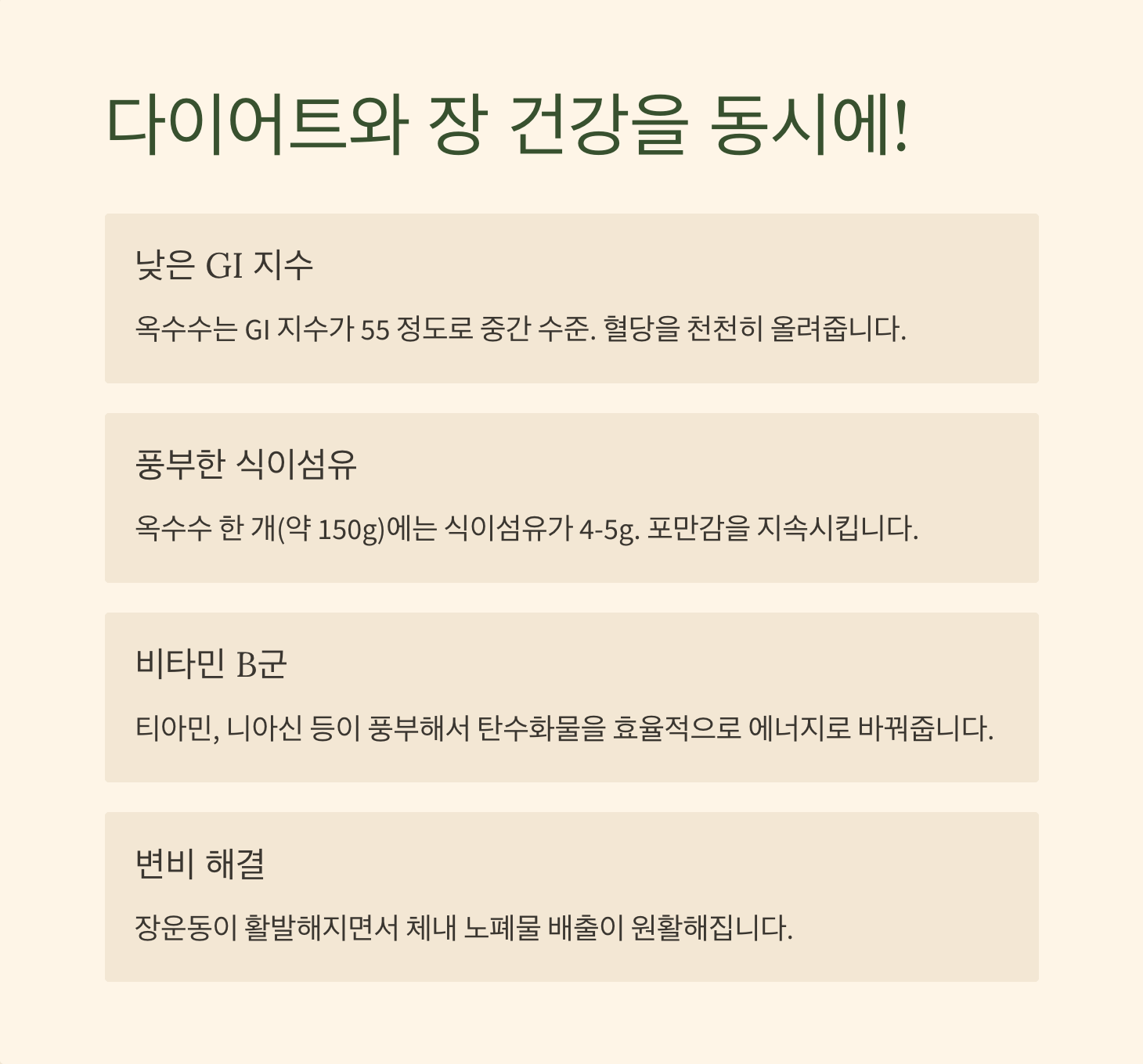 - 장 건강 솔루션: 옥수수의 식이섬유가 장 건강에 좋다는 걸 확인하셨다면, 변비나 소화 불량을 근본적으로 해결하는 방법들을 알아보세요.
