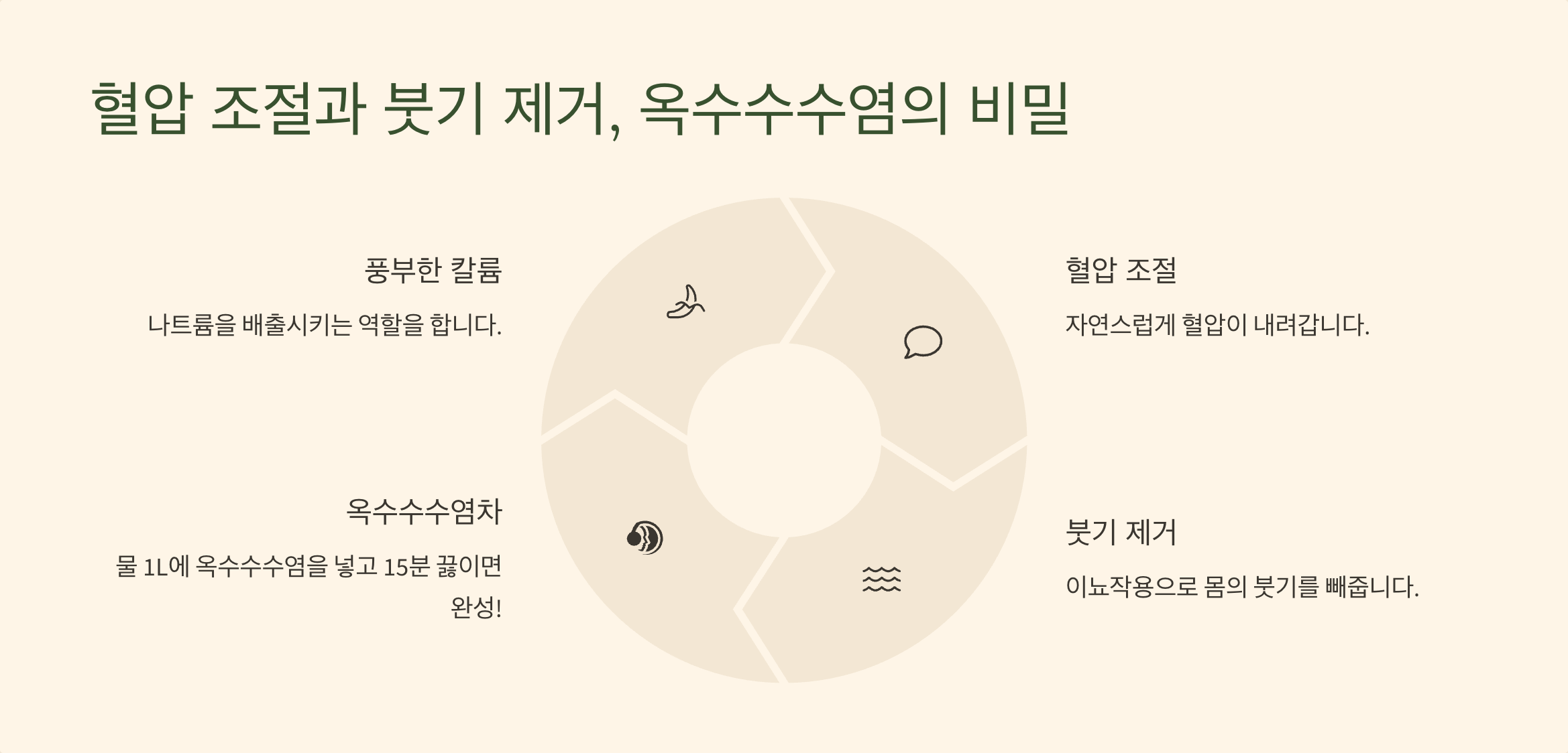 - 혈압 관리 식단: 옥수수수염의 혈압 조절 효능에 관심이 있으시다면, 고혈압 환자를 위한 종합적인 식단 가이드도 도움이 될 거예요.