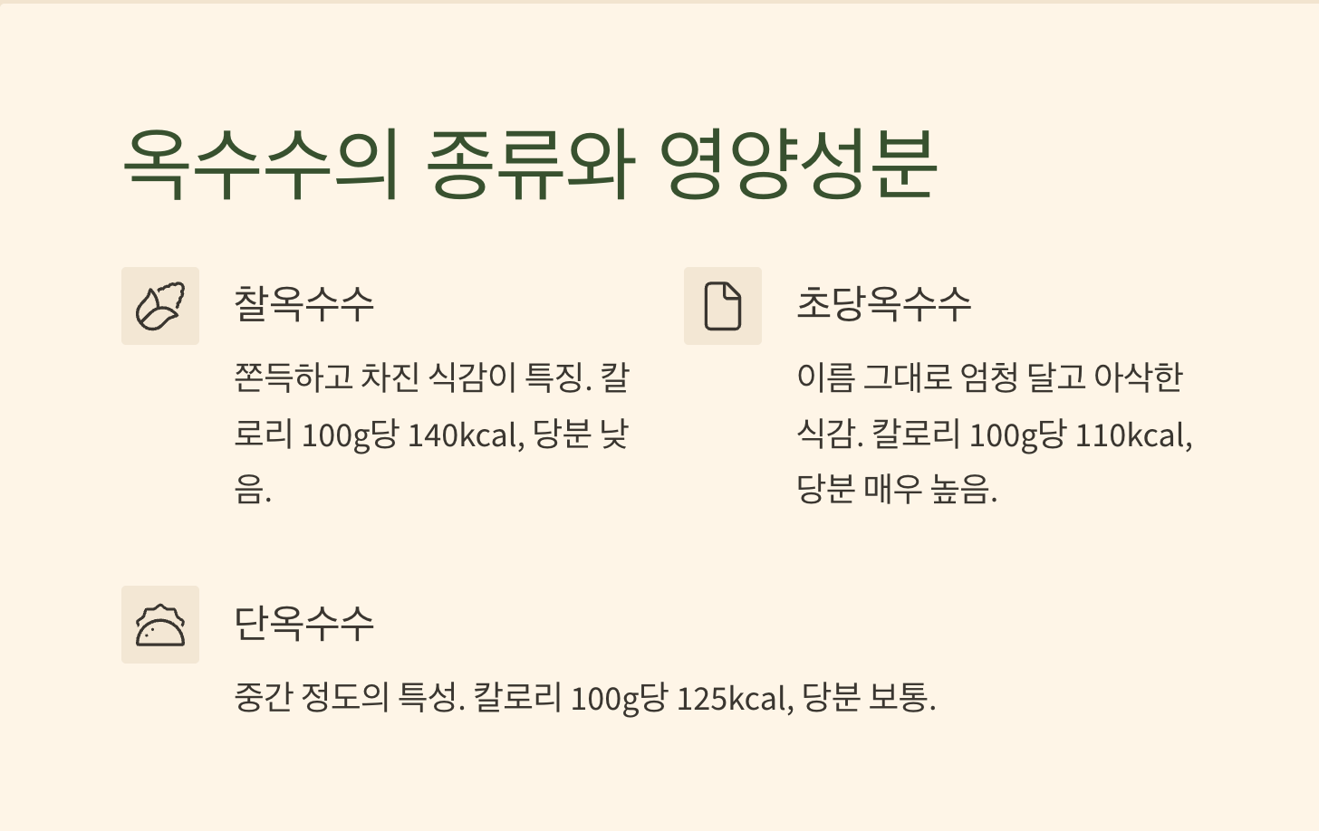 | 구분 | 찰옥수수 | 초당옥수수 | 단옥수수 |