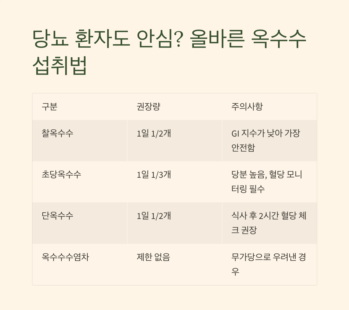 | 초당옥수수 | 1일 1/3개 | 당분 높음, 혈당 모니터링 필수 |