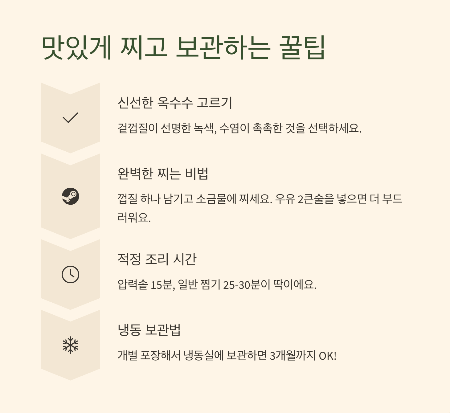 - 냉동 보관법: 한 번에 많이 쪄서 식힌 후 개별 포장해서 냉동실에 보관하면 3개월까지 OK!
