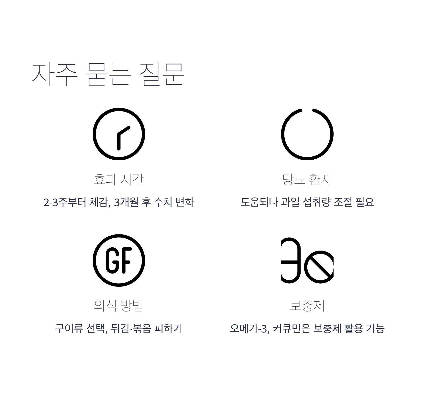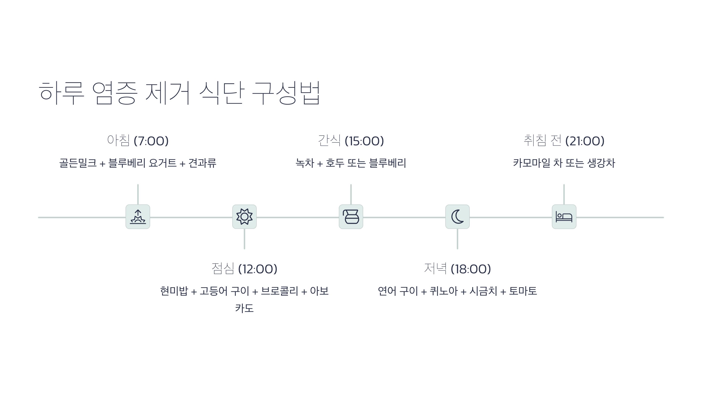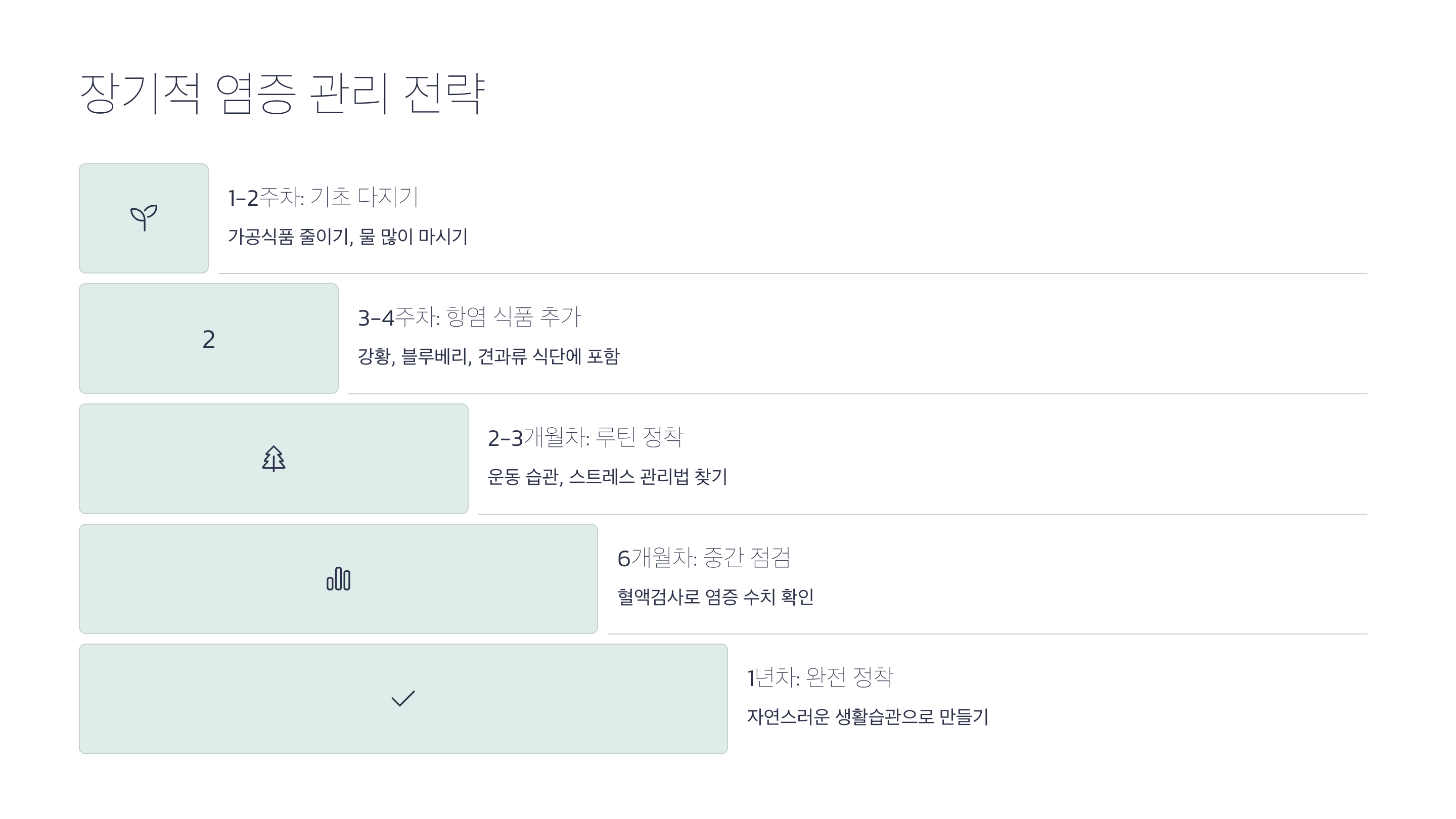 - 3-4주차: 항염 식품 추가 - 강황, 블루베리, 견과류 등 하나씩 식단에 포함