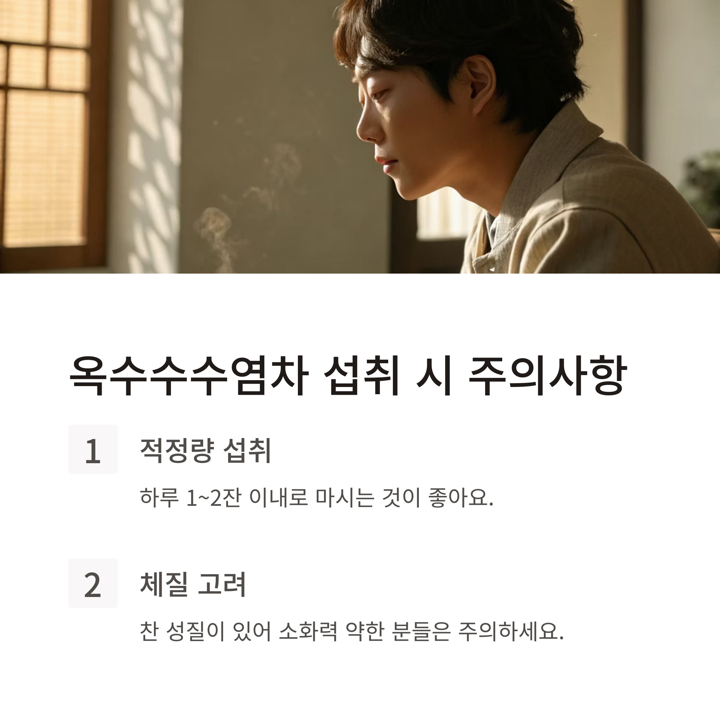 - 체질 고려: 옥수수수염차는 찬 성질을 가지고 있어요. 평소 소화력이 약하거나 찬 음식에 민감하다면 복통이나 설사를 유발할 수 있으니 소량부터 시작해보세요.