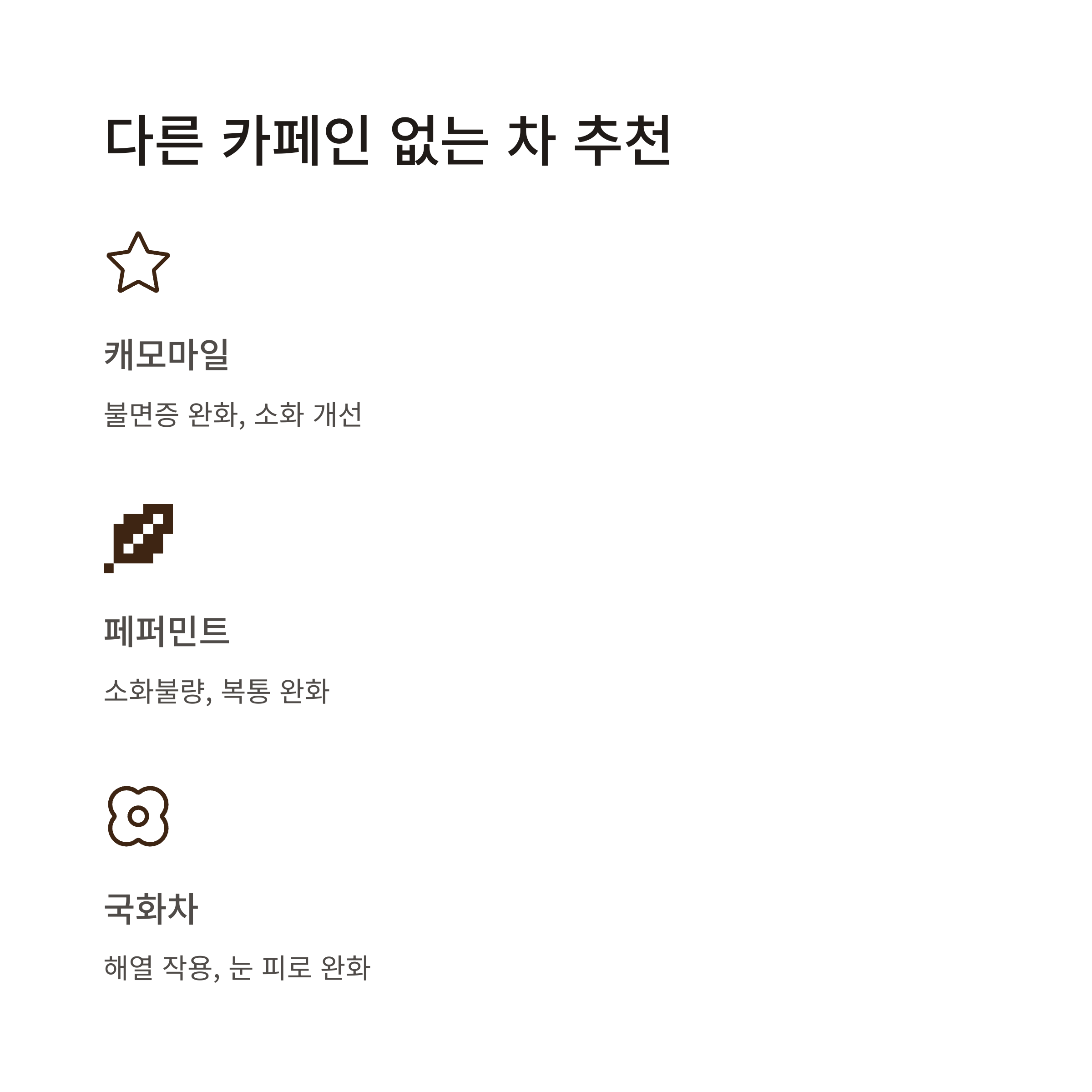 - 캐모마일 차: 불면증 완화와 소화 개선에 탁월한 효능을 가진 허브차입니다. 향이 부드러워 심신 안정에 도움이 돼요.