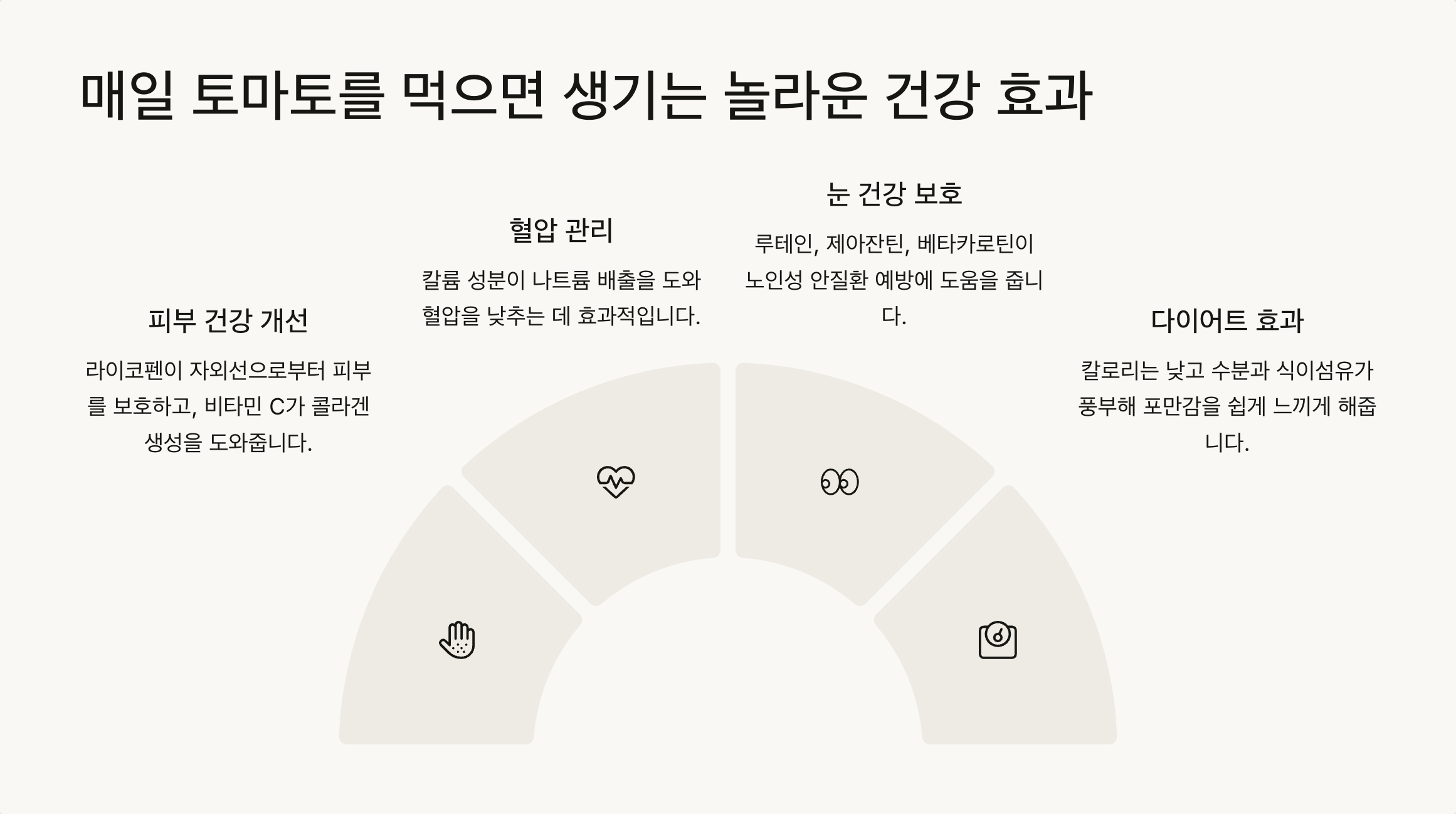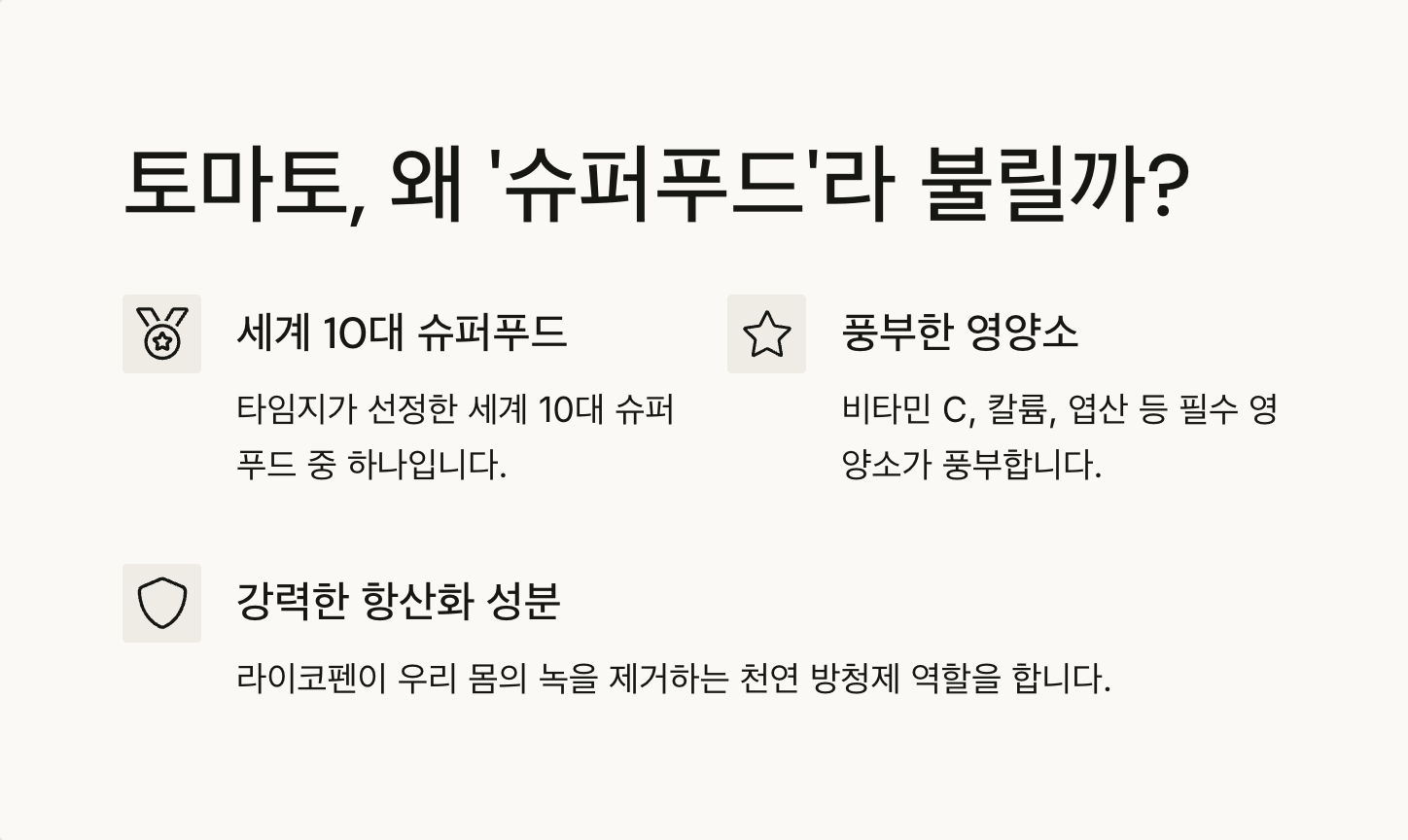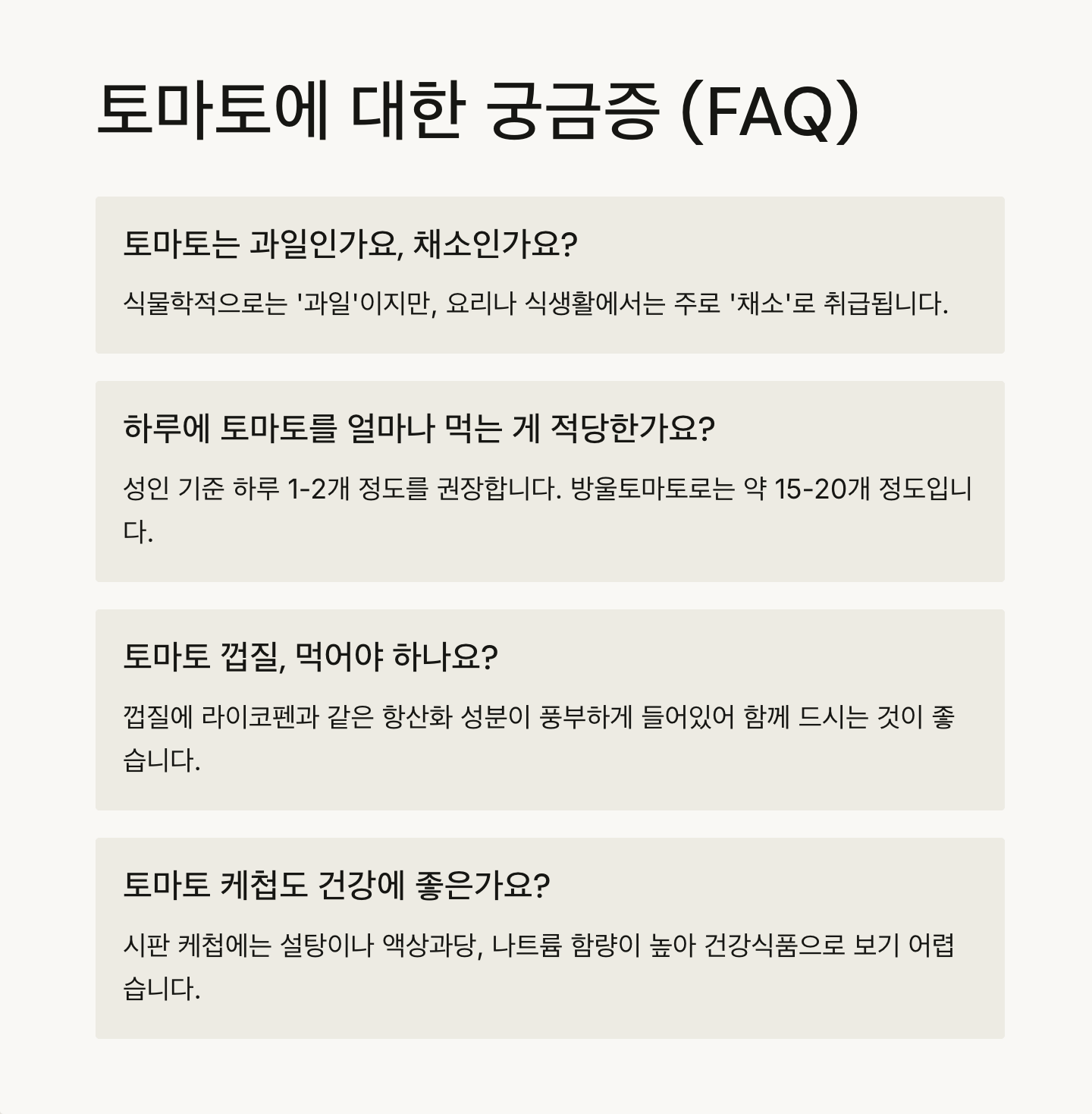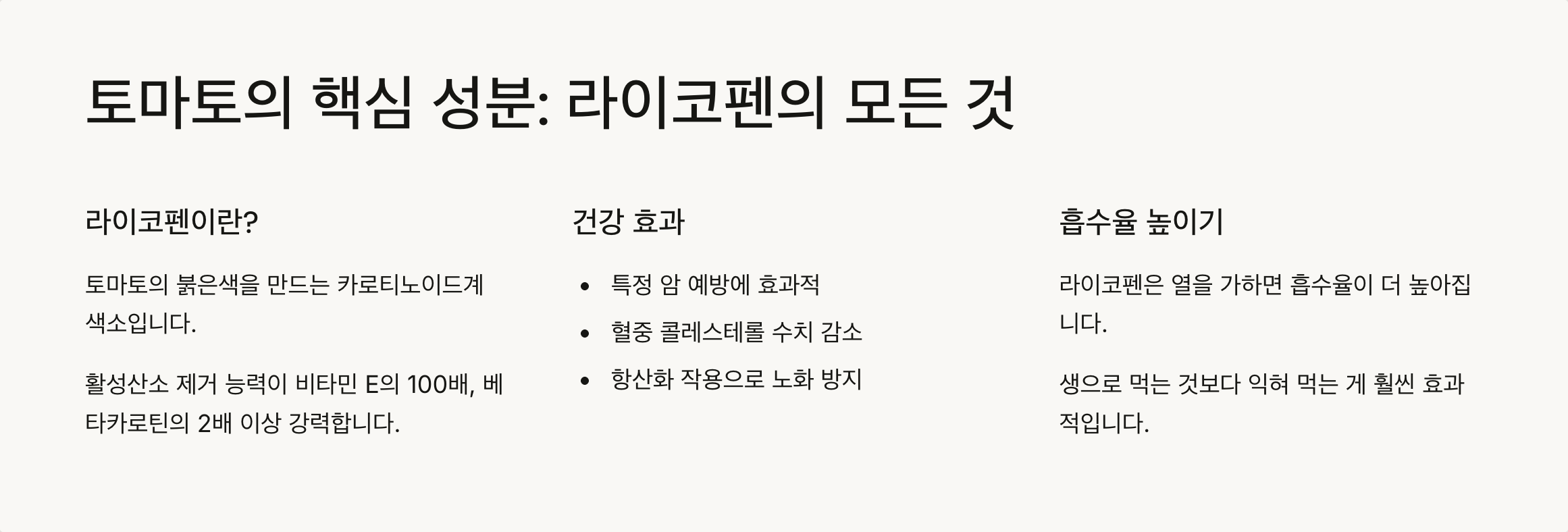 💡 오늘부터 시작하기: 마트에 들러 가장 신선해 보이는 토마토 한 팩을 사서, 저녁 식사에 올리브유와 함께 곁들여 보세요. 가장 쉽고 빠른 건강의 시작입니다!